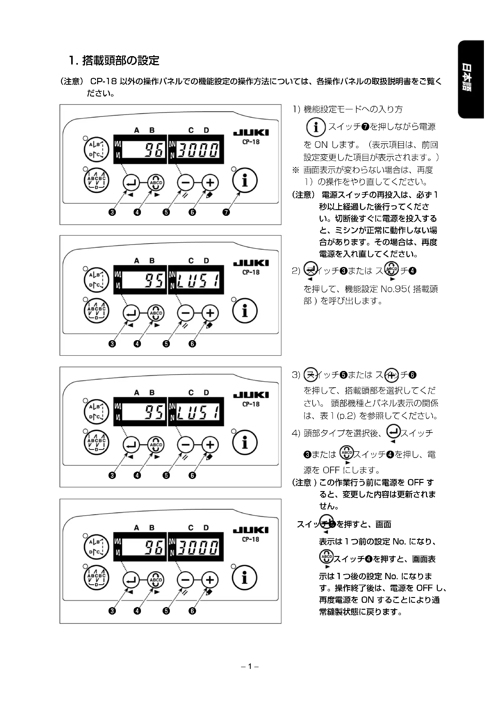 スイッチ❸を押すと、画面 表示は1つ前の設定 No. になり、 スイッチ❹を押すと、画面表 示は1つ後の設定 No. になりま す。操作終了後は、電源を OFF し、 再度電源を ON することにより通 常縫製状態に戻ります。