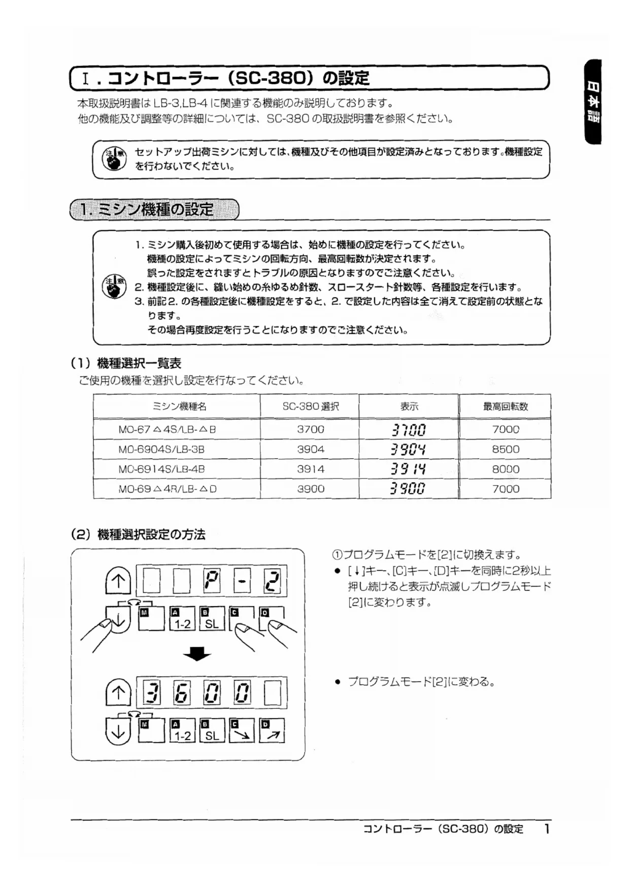 本取扱説明書は LB‑3,LB‑4 に関連する機能のみ説明しております。他の機能及び調整等の詳細については、SC‑380の取扱説明書を参照ください。,ノ⑥セットアップ出荷ミシンに対しては、機種及びその他項目が設定済みとなっております。機種設定を行わないでください。 i!l! 冨ミシン機種の設定 ) ,.ミシン購入後初めて使用する場合は、始めに機種の設定を行ってください。機種の設定によってミシンの回転方向、最高回転数が決定されます。 cf) 誤った設定をされますとトラブルの原因となりますのでこ注意ください。