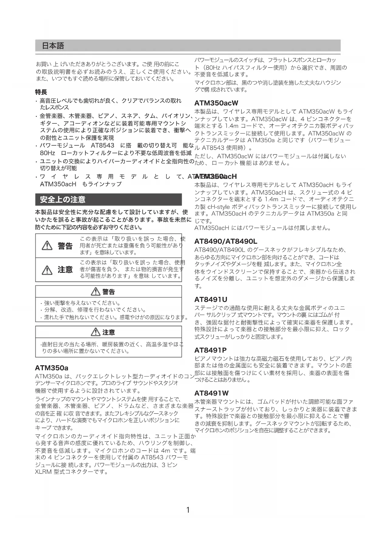 ATM350acH にはパワーモジュールは付属しません。 AT8490/AT8490L AT8490/AT8490L のグースネックがフレキシブルなため、 あらゆる方向にマイクロホン部を向けることができ、コードは タッチノイズやダメージを軽 減します。また、マイクロホン全 体をウインドスクリーンで保持することで、楽器から伝送され るノイズを分離し、ユニットを想定外のダメージから保護しま
