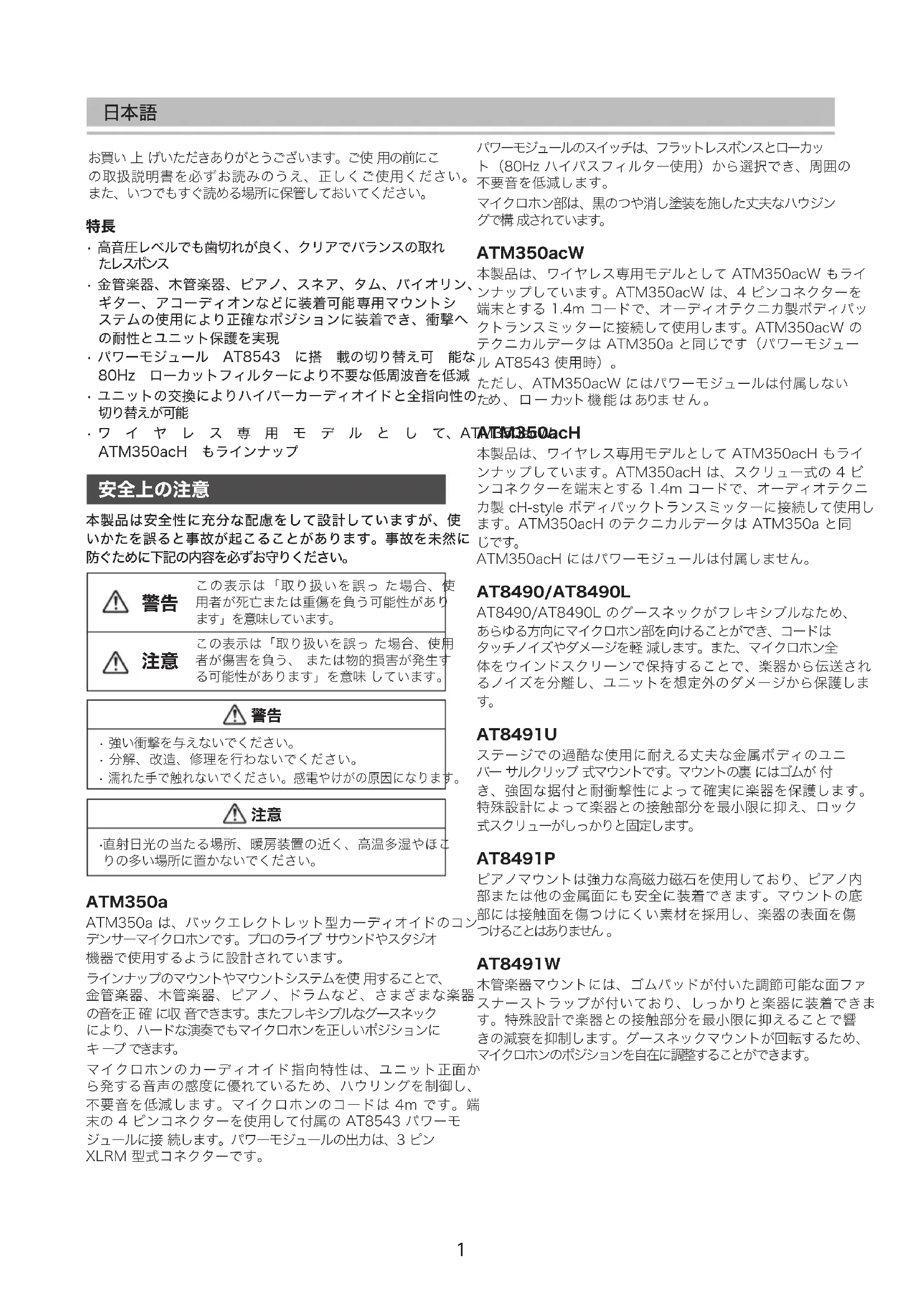 ATM350acH にはパワーモジュールは付属しません。 AT8490/AT8490L AT8490/AT8490L のグースネックがフレキシブルなため、 あらゆる方向にマイクロホン部を向けることができ、コードは タッチノイズやダメージを軽 減します。また、マイクロホン全 体をウインドスクリーンで保持することで、楽器から伝送され るノイズを分離し、ユニットを想定外のダメージから保護しま
