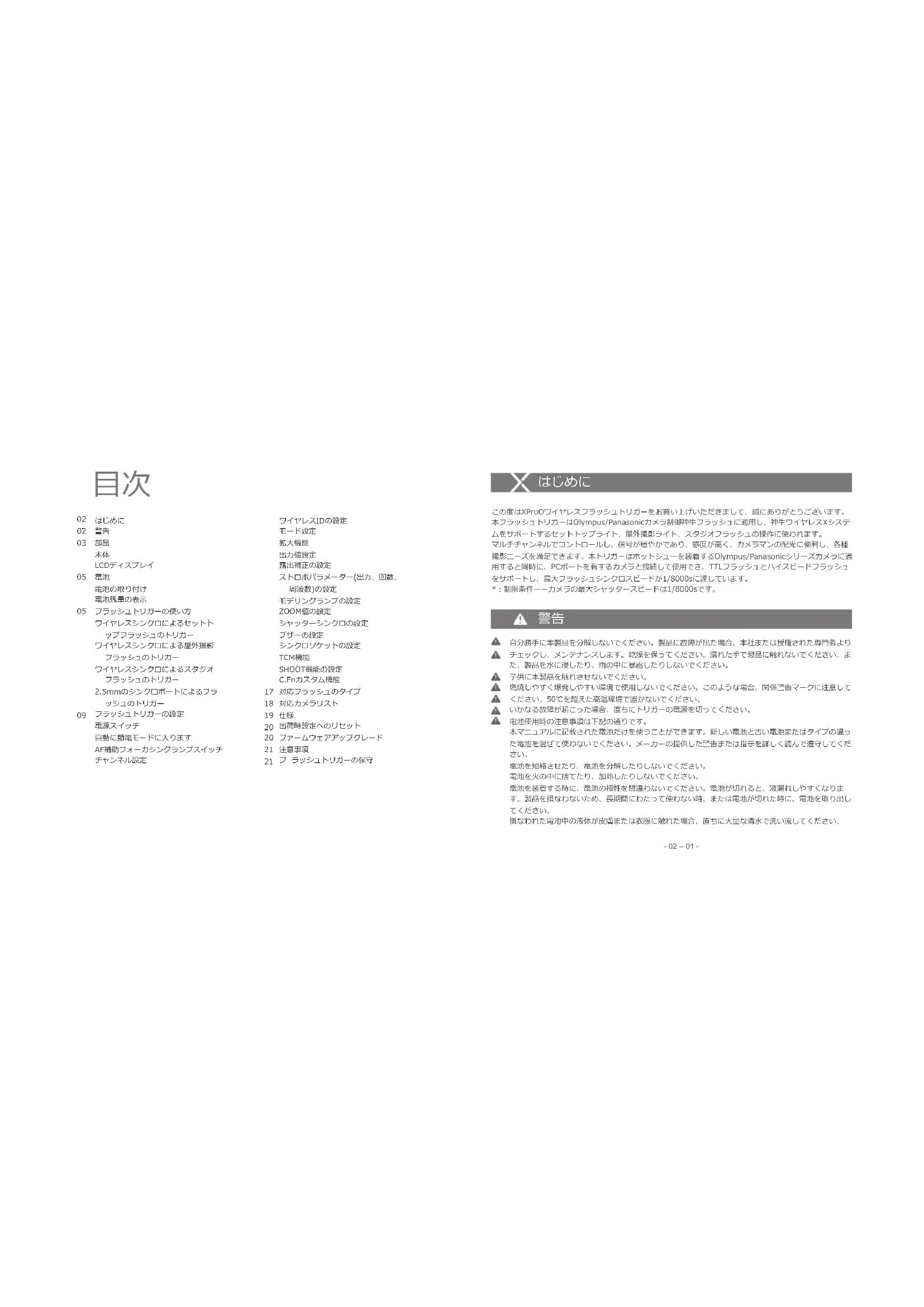 マルチチャンネルでコントロールし、信号が穏やかであり、感度が⾼く、カメラマンの配光に便利し、各種 撮影ニーズを満⾜できます。本トリガーはホットシューを装着するOlympus/Panasonicシリーズカメラに適 ⽤すると同時に、PCポートを有するカメラと接続して使⽤でき、TTLフラッシュとハイスピードフラッシュ をサポートし、最⼤フラッシュシンクロスピードが1/8000sに達しています。 この度はXProOワイヤレスフラッシュトリガーをお買い上げいただきまして、誠にありがとうございます。 本フラッシュトリガーはOlympus/Panasonicカメラ制御神⽜フラッシュに適⽤し、神⽜ワイヤレスXシステ ムをサポートするセットトップライト、屋外撮影ライト、スタジオフラッシュの操作に使われます。 *:制限条件カメラの最⼤シャッタースピードは1/8000sです。