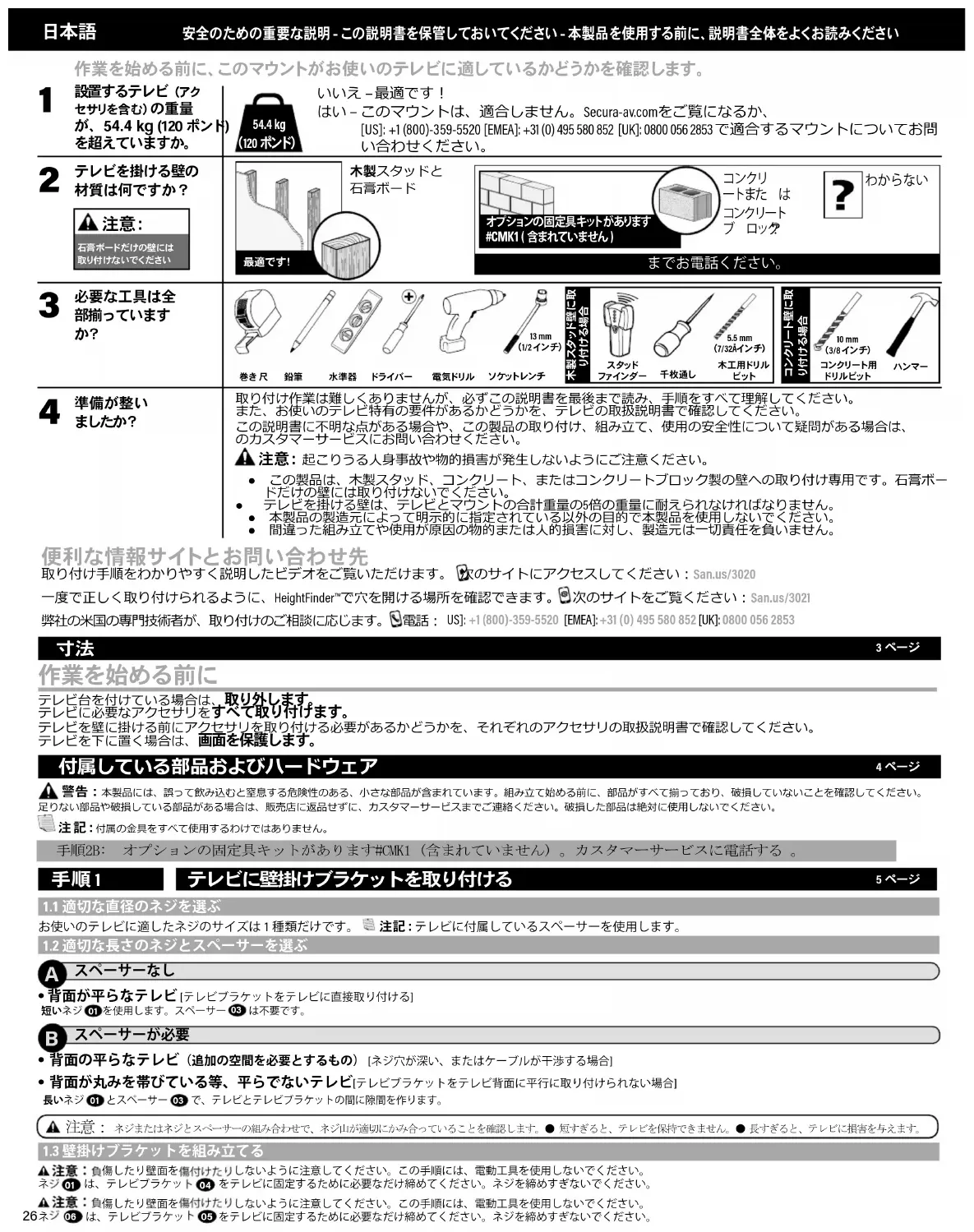 10 mm (3/8 イン チ) 便利な情報サイトとお問い合わせ先 テレビ台を付けている場合は、取り外します。テレビに必要なアクセサリをすべて取り付けます。テレビを壁に掛ける前にアクセサリを取り付ける必要があるかどうかを、それぞれのアクセサリの取扱説明書で確認してください。テレビを下に置く場合は、画面を保護します。 取り付け手順をわかりやすく説明したビデオをご覧いただけます。 次のサイトにアクセスしてください:San.us/3020 一度で正しく取り付けられるように、HeightFinder™で穴を開ける場所を確認できます。 次のサイトをご覧ください:San.us/3021 弊社の米国の専門技術者が、取り付けのご相談に応じます。 電話: 警告:本製品には、誤って飲み込むと窒息する危険性のある、小さな部品が含まれています。組み立て始める前に、部品がすべて揃っており、破損していないことを確認してください。 足りない部品や破損している部品がある場合は、販売店に返品せずに、カスタマーサービスまでご連絡ください。破損した部品は絶対に使用しないでください。 注 記:付属の金具をすべて使用するわけではありません。 手順 1 テレビに壁掛けブラケットを取り付ける 5 ページ