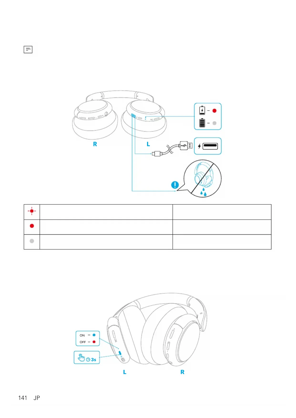 - 充電中は、ヘッドホンの電源を入れないでください。 R L 60秒に1回、赤色の点滅低バッテリー