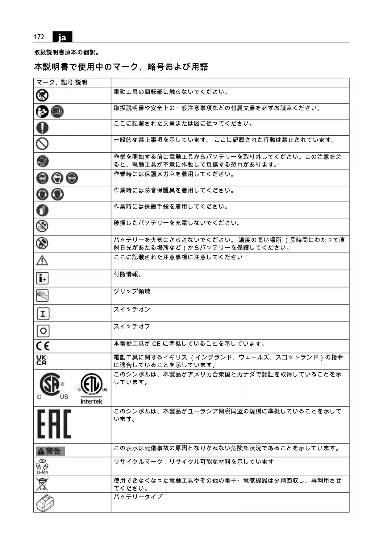 本電動工具が CE に準拠していることを示しています。 電動工具に関するイギリス (イングランド、ウェールズ、スコットランド)の指令 に適合していることを示しています。 このシンボルは、本製品がアメリカ合衆国とカナダで認証を取得していることを示