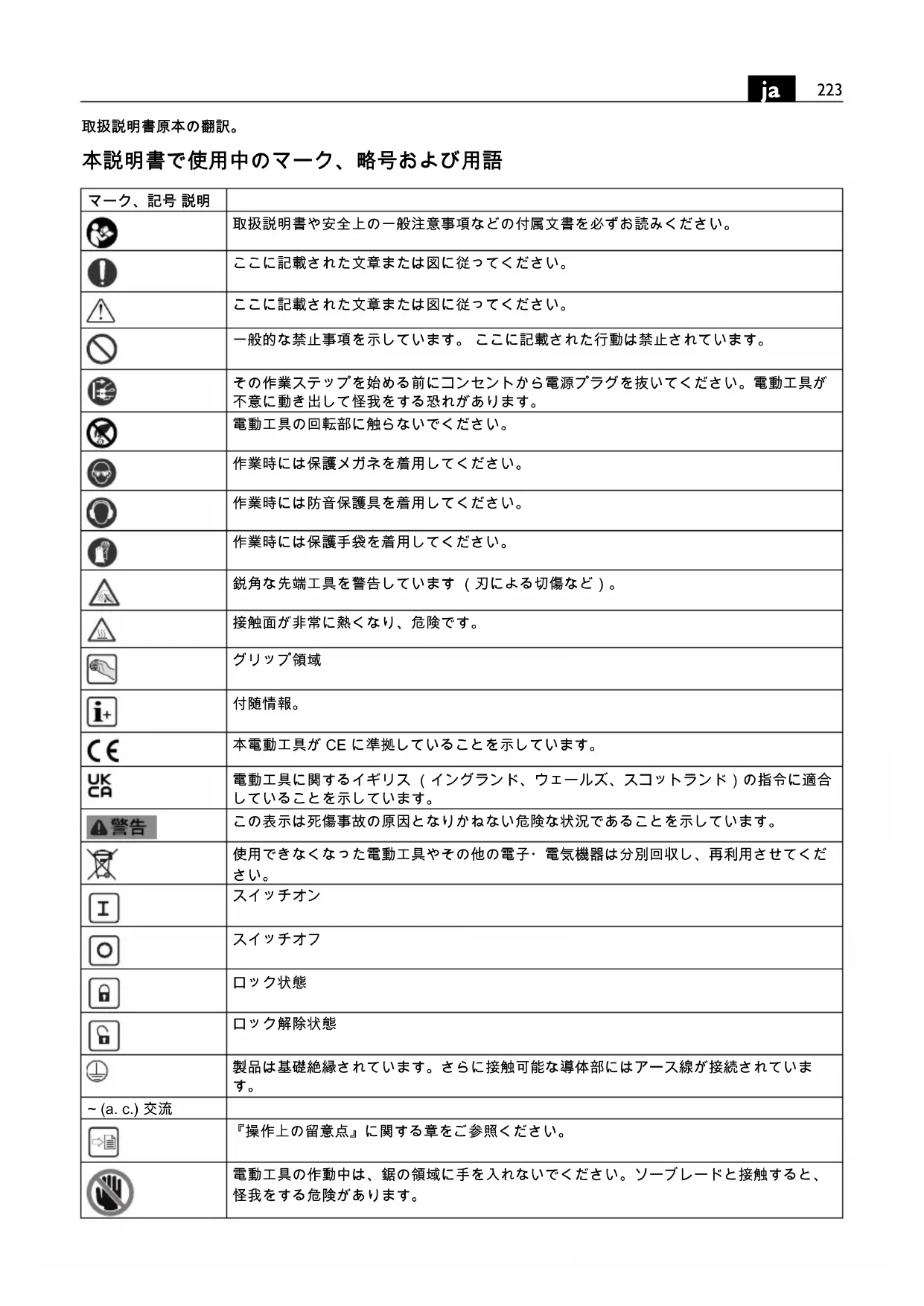 ~ (a. c.) 交流 『操作上の留意点』に関する章をご参照ください。 電動工具の作動中は、鋸の領域に手を入れないでください。ソーブレードと接触すると、 怪我をする危険があります。224