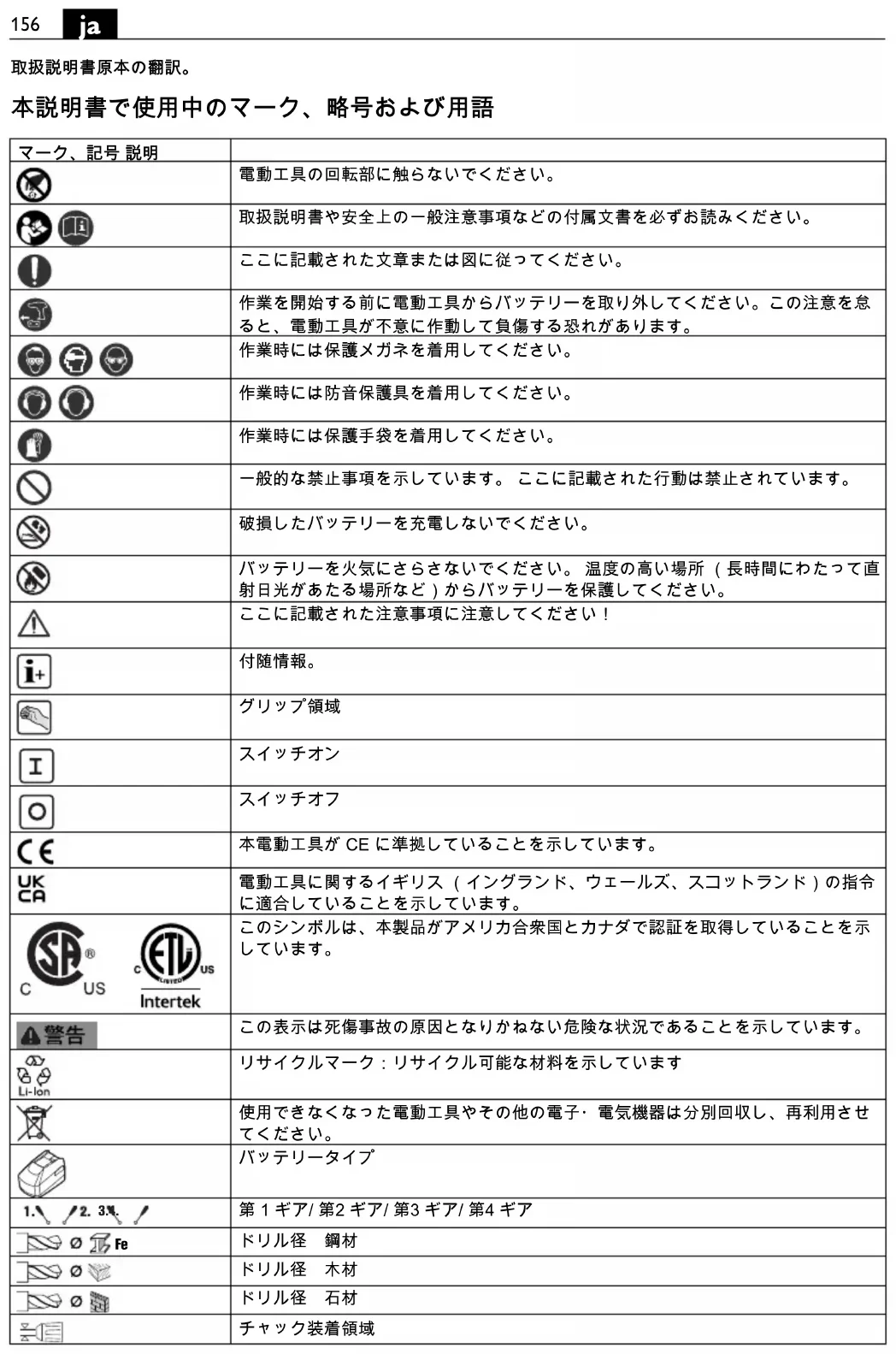 本電動工具が CE に準拠していることを示しています。 電動工具に関するイギリス (イングランド、ウェールズ、スコットランド)の指令 に適合していることを示しています。 このシンボルは、本製品がアメリカ合衆国とカナダで認証を取得していることを示