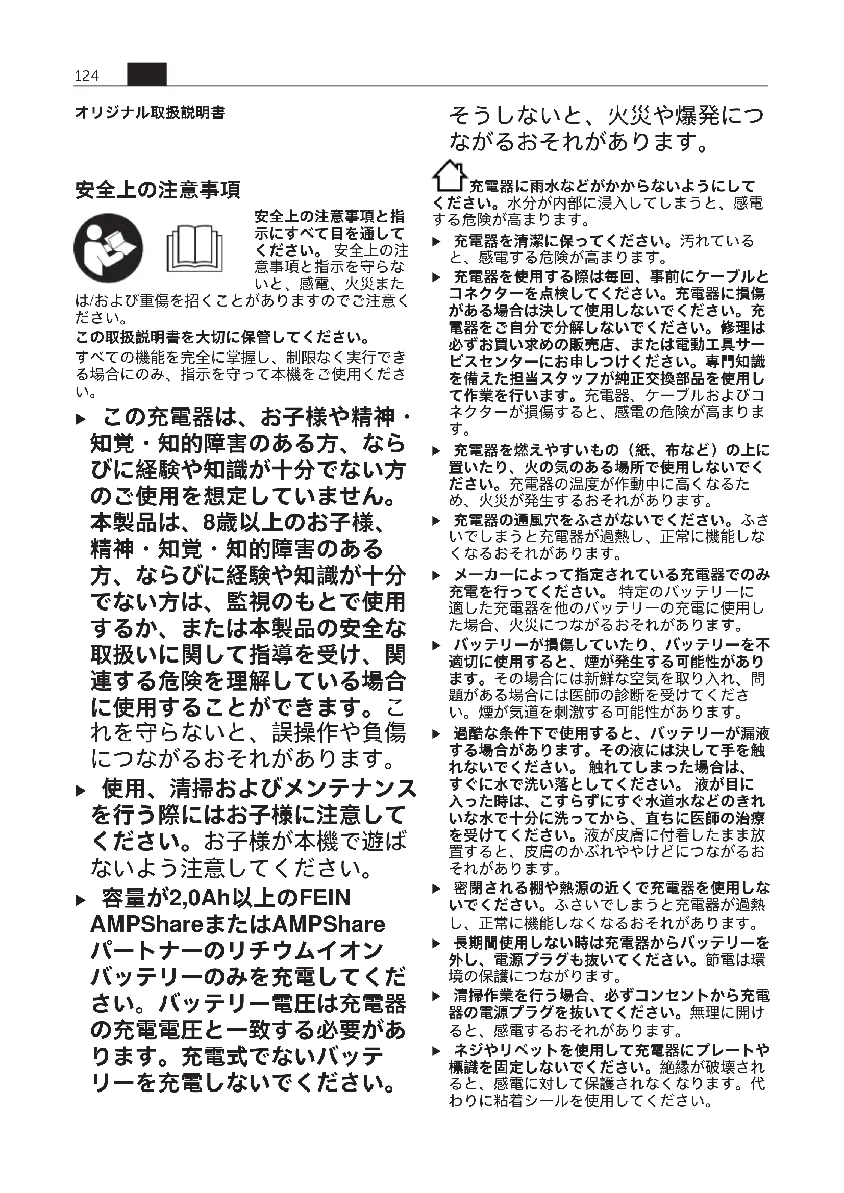 u この充電器は、お子様や精神・ 知覚・知的障害のある方、なら びに経験や知識が十分でない方 のご使用を想定していません。 本製品は、8歳以上のお子様、 精神・知覚・知的障害のある 方、ならびに経験や知識が十分 でない方は、監視のもとで使用 するか、または本製品の安全な 取扱いに関して指導を受け、関 連する危険を理解している場合 に使用することができます。こ れを守らないと、誤操作や負傷 につながるおそれがあります。 u 使用、清掃およびメンテナンス を行う際にはお子様に注意して ください。お子様が本機で遊ば ないよう注意してください。 u 容量が2,0Ah以上のFEIN AMPShareまたはAMPShare パートナーのリチウムイオン バッテリーのみを充電してくだ さい。バッテリー電圧は充電器 の充電電圧と一致する必要があ ります。充電式でないバッテ リーを充電しないでください。 そうしないと、火災や爆発につ ながるおそれがあります。 充電器に雨水などがかからないようにして ください。水分が内部に浸入してしまうと、感電 する危険が高まります。 u 充電器を清潔に保ってください。汚れている と、感電する危険が高まります。 u 充電器を使用する際は毎回、事前にケーブルと コネクターを点検してください。充電器に損傷 がある場合は決して使用しないでください。充 電器をご自分で分解しないでください。修理は 必ずお買い求めの販売店、または電動工具サー ビスセンターにお申しつけください。専門知識 を備えた担当スタッフが純正交換部品を使用し て作業を行います。充電器、ケーブルおよびコ ネクターが損傷すると、感電の危険が高まりま