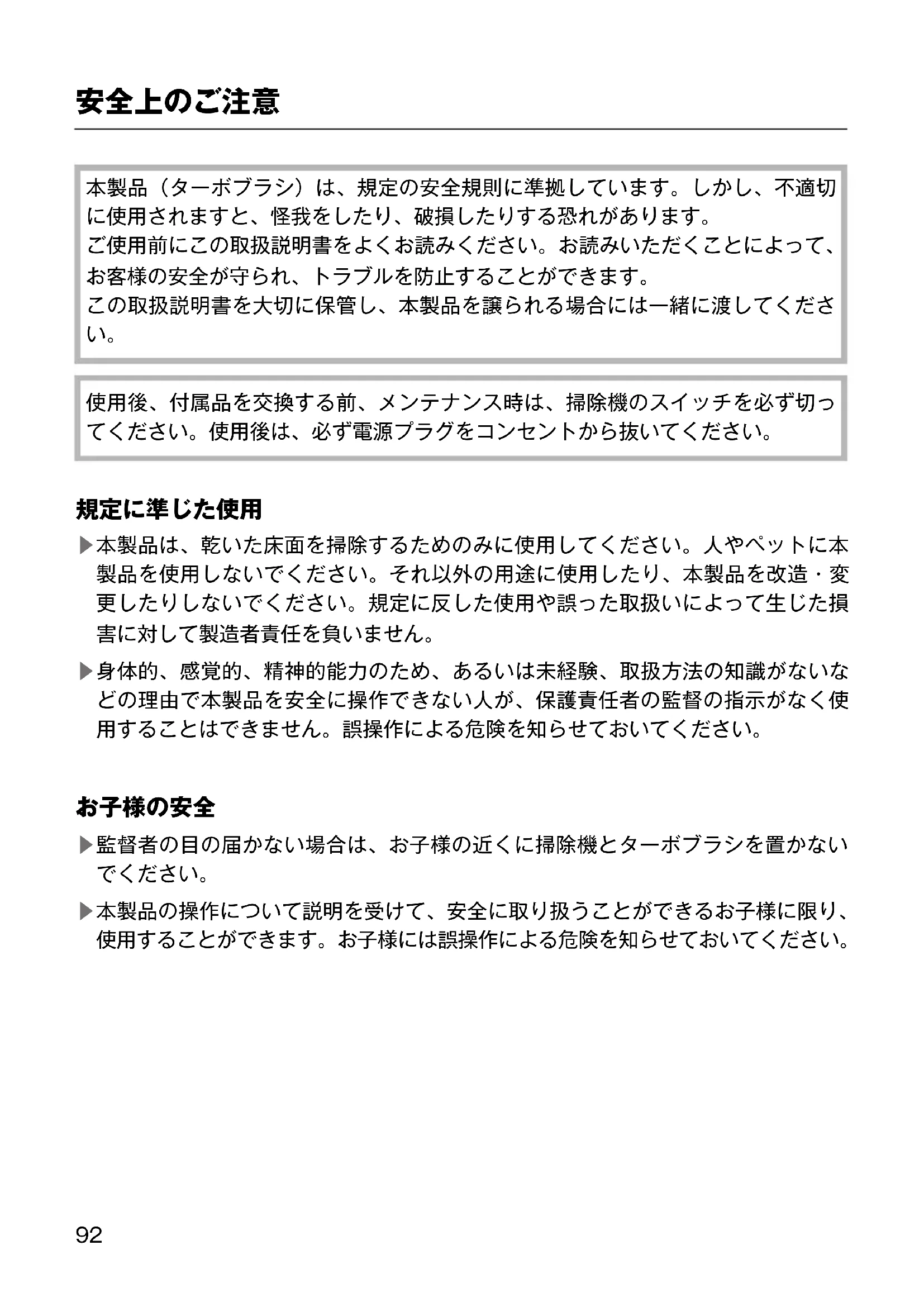 ▶本製品の操作について説明を受けて、安全に取り扱うことができるお子様に限り、 使用することができます。お子様には誤操作による危険を知らせておいてください。安全上のご注意