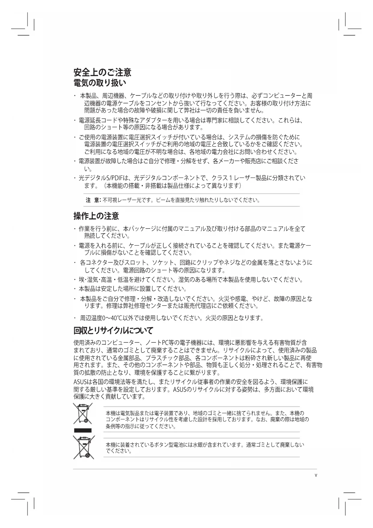回収とリサイクルについて 使用済みのコンピューター、ノートPC等の電子機器には、環境に悪影響を与える有害物質が含 まれており、通常のゴミとして廃棄することはできません。リサイクルによって、使用済みの製品 に使用されている金属部品、プラスチック部品、各コンポーネントは粉砕され新しい製品に再使 用されます。また、その他のコンポーネントや部品、物質も正しく処分・処理されることで、有害物 質の拡散の防止となり、環境を保護することに繋がります。 ASUSは各国の環境法等を満たし、またリサイクル従事者の作業の安全を図るよう、環境保護に 関する厳しい基準を設定しております。ASUSのリサイクルに対する姿勢は、多方面において環境 保護に大きく貢献しています。