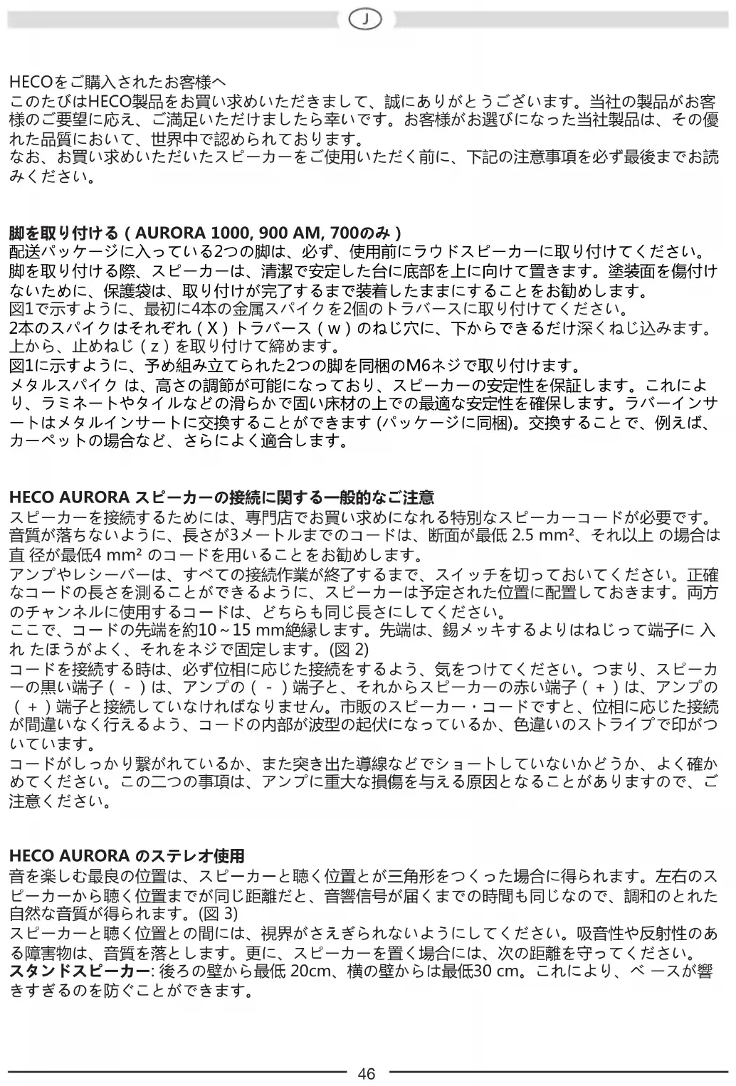 HECO AURORA のステレオ使用 音を楽しむ最良の位置は、スピーカーと聴く位置とが三角形をつくった場合に得られます。左右のス ピーカーから聴く位置までが同じ距離だと、音響信号が届くまでの時間も同じなので、調和のとれた 自然な音質が得られます。(図 3) スピーカーと聴く位置との間には、視界がさえぎられないようにしてください。吸音性や反射性のあ る障害物は、音質を落とします。更に、スピーカーを置く場合には、次の距離を守ってください。 スタンドスピーカー: 後ろの壁から最低 20cm、横の壁からは最低30 cm。これにより、ベ ースが響 きすぎるのを防ぐことができます。47 壁掛け式スピーカー: 棚型スピーカーをご使用の場合にも横および後ろの壁や物体から10cm以上 の距 離を確保し、高音用スピーカーが耳の高さに来るように置いてください。 スパイク (スタンドスピーカー): スピーカーを設置の時には、一緒に包装されており ますスパイクを 使用してください。これにより、スピーカーは床の敷物に直接触れることがないので、好ましくない 共鳴が起きるのを防ぐことができます。スタンド式ボックスの場合には金属製スパイクまたは硬ゴム 製スパイクをご使用になれます。各スパイクはボックス下部のねじスリーブ内にねじ込みます。 HECO AURORAをフロントあるいはリア・スピーカーとしてご使用の場合 フロント・スピーカーは、右と左にテレビからできるだけ同じ距離を置いて、耳の高さに取り付けて ください。リア(後部)・スピーカーの場合は、聞く位置の横か、できればその後ろに右と左に、耳 の高さか、あるいはそれよりやや高く、取り付けます。(図 4)