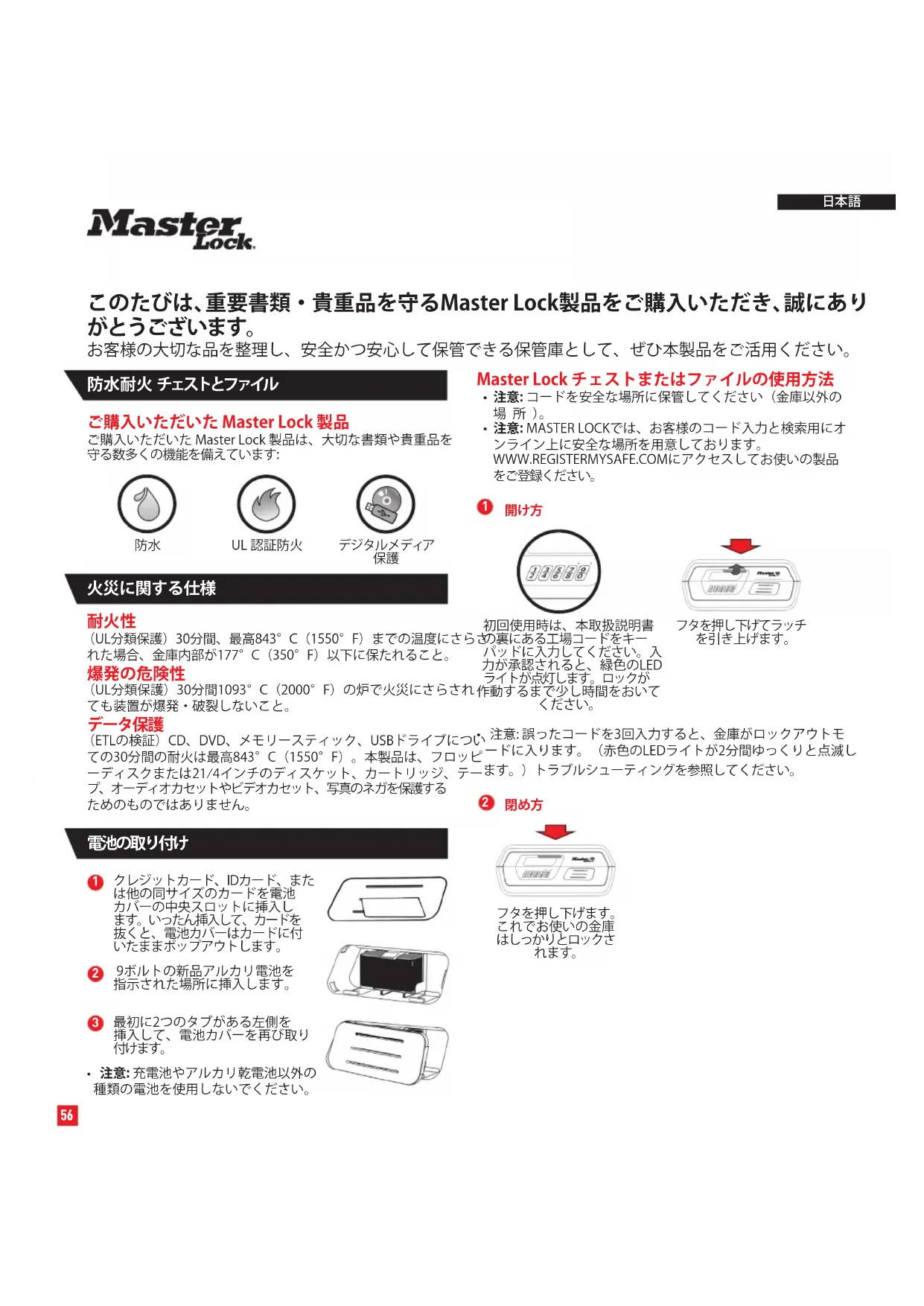 ·注意:Master Lockは、金庫に保管た製品の水分による損害にしだての責任は負いURY。
