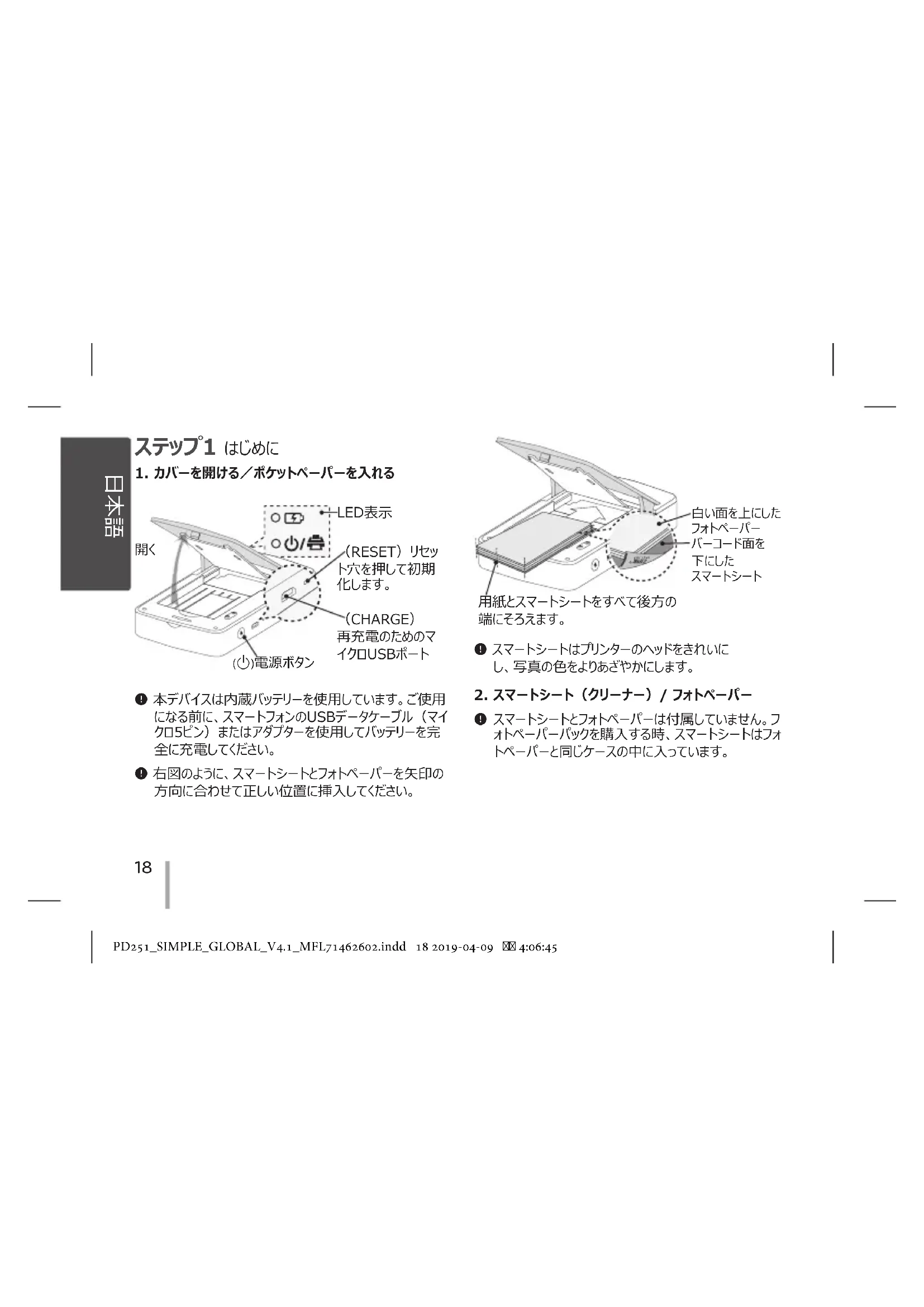 , 本デバイスは内蔵バッテリーを使用しています。ご使用 になる前に、スマートフォンのUSBデータケーブル(マイ クロ5ピン)またはアダプターを使用してバッテリーを完 全に充電してください。 , 右図のように、スマートシートとフォトペーパーを矢印の 方向に合わせて正しい位置に挿入してください。