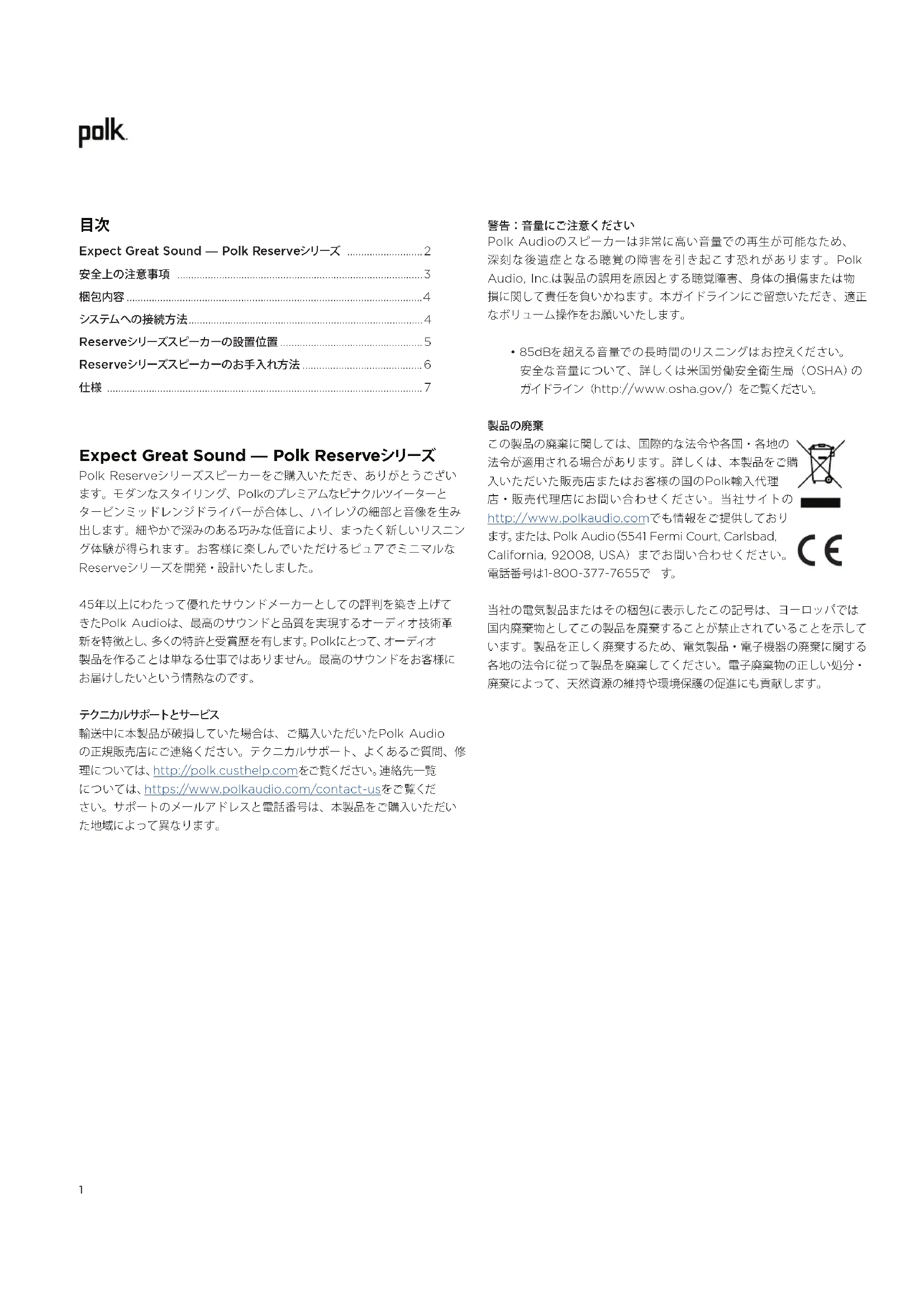 この製品の廃棄に関しては、国際的な法令や各国・各地の 法令が適用される場合があります。詳しくは、本製品をご購 入いただいた販売店またはお客様の国のPolk輸入代理 店・販売代理店にお問い合わせください。当社サイトの http://www.polkaudio.comでも情報をご提供しており ます。または、Polk Audio(5541 Fermi Court, Carlsbad, California, 92008, USA)までお問い合わせください。 電話番号は1-800-377-7655で す。 当社の電気製品またはその梱包に表示したこの記号は、ヨーロッパでは 国内廃棄物としてこの製品を廃棄することが禁止されていることを示して います。製品を正しく廃棄するため、電気製品・電子機器の廃棄に関する 各地の法令に従って製品を廃棄してください。電子廃棄物の正しい処分・ 廃棄によって、天然資源の維持や環境保護の促進にも貢献します。 Expect Great Sound Polk Reserveシリーズ Polk Reserveシリーズスピーカーをご購入いただき、ありがとうござい ます。モダンなスタイリング、Polkのプレミアムなピナクルツイーターと タービンミッドレンジドライバーが合体し、ハイレゾの細部と音像を生み 出します。細やかで深みのある巧みな低音により、まったく新しいリスニン グ体験が得られます。お客様に楽しんでいただけるピュアでミニマルな Reserveシリーズを開発・設計いたしました。 45年以上にわたって優れたサウンドメーカーとしての評判を築き上げて きたPolk Audioは、最高のサウンドと品質を実現するオーディオ技術革 新を特徴とし、多くの特許と受賞歴を有します。Polkに と っ て 、オ ー デ ィ オ 製品を作ることは単なる仕事ではありません。最高のサウンドをお客様に お届けしたいという情熱なのです。 テクニカルサポートとサービス 輸送中に本製品が破損していた場合は、ご購入いただいたPolk Audio の正規販売店にご連絡ください。テクニカルサポート、よくあるご質問、修 理については、http://polk.custhelp.comをご覧ください。連絡先一覧 については、https://www.polkaudio.com/contact-usをご覧くだ さい。サポートのメールアドレスと電話番号は、本製品をご購入いただい た地域によって異なります。