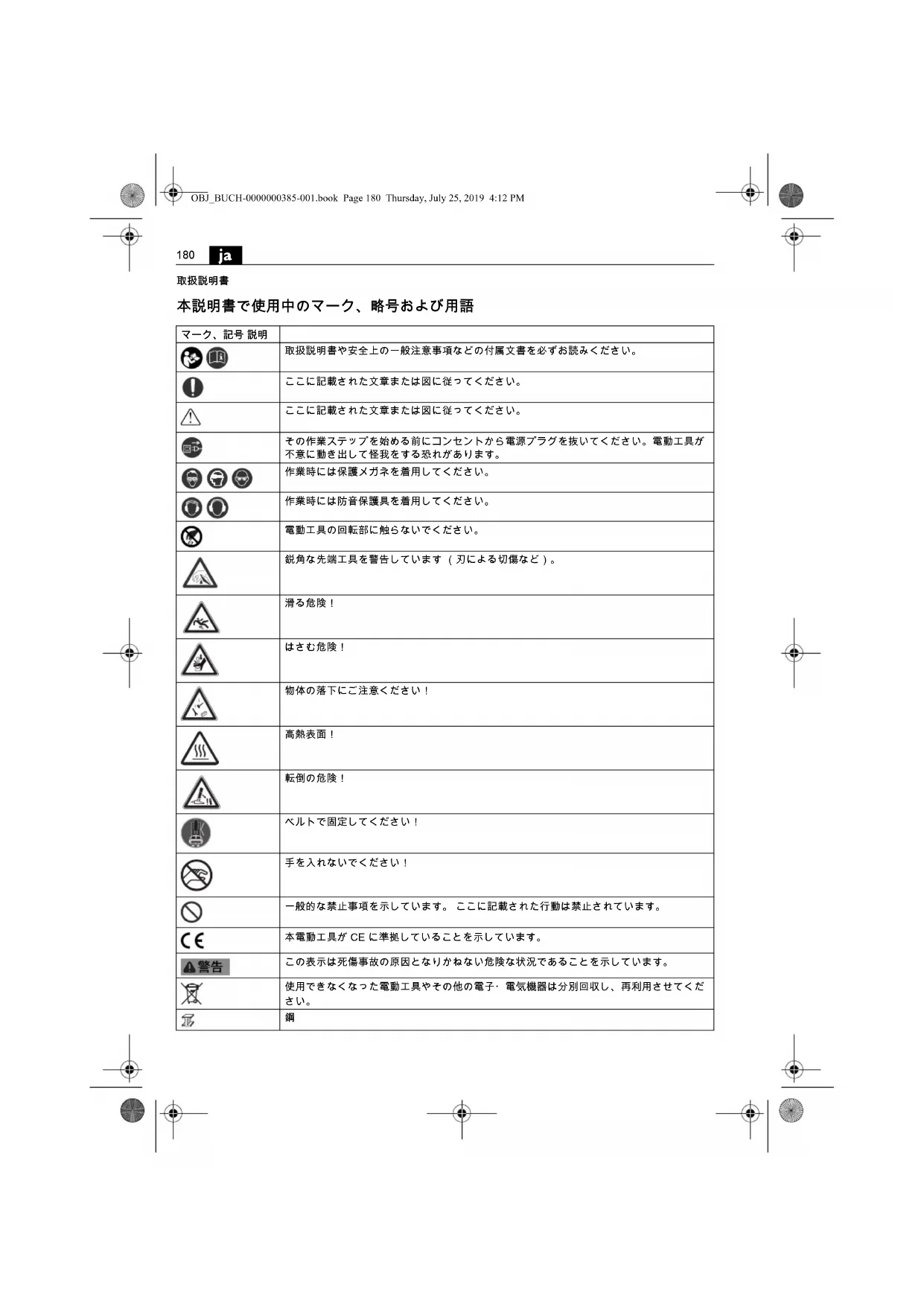 ベルトで固定してください! 手を入れないでください! 一般的な禁止事項を示しています。 ここに記載された行動は禁止されています。 本電動工具が CE に準拠していることを示しています。 この表示は死傷事故の原因となりかねない危険な状況であることを示しています。 使用できなくなった電動工具やその他の電子・電気機器は分別回収し、再利用させてくだ