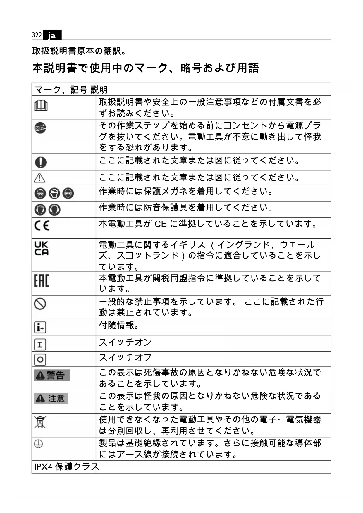 使用できなくなった電動工具やその他の電子・電気機器 は分別回収し、再利用させてください。 製品は基礎絶縁されています。さらに接触可能な導体部 にはアース線が接続されています。 IPX4 保護クラス323