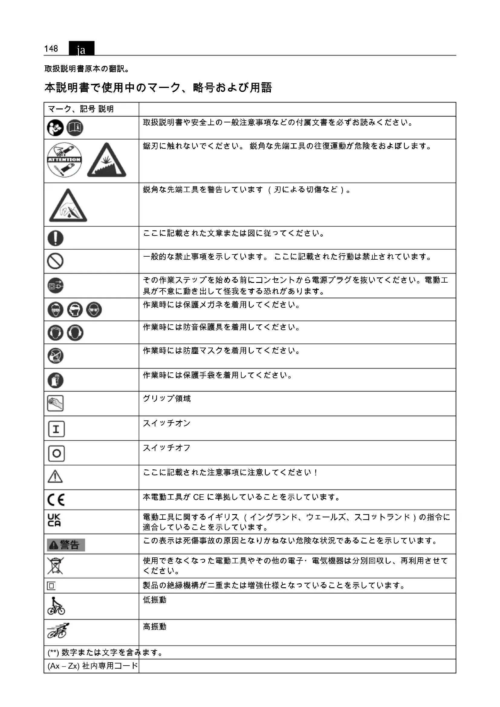 ここに記載された注意事項に注意してください! 本電動工具が CE に準拠していることを示しています。 電動工具に関するイギリス (イングランド、ウェールズ、スコットランド)の指令に 適合していることを示しています。 この表示は死傷事故の原因となりかねない危険な状況であることを示しています。 使用できなくなった電動工具やその他の電子・電気機器は分別回収し、再利用させて