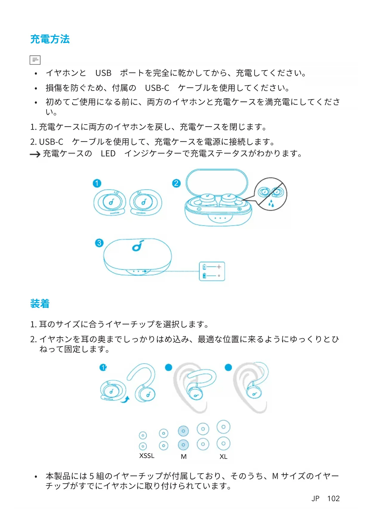 - 本製品には5組のイヤーチップが付属しており、そのうち、Mサイズのイヤー チップがすでにイヤホンに取り付けられています。JP 103
