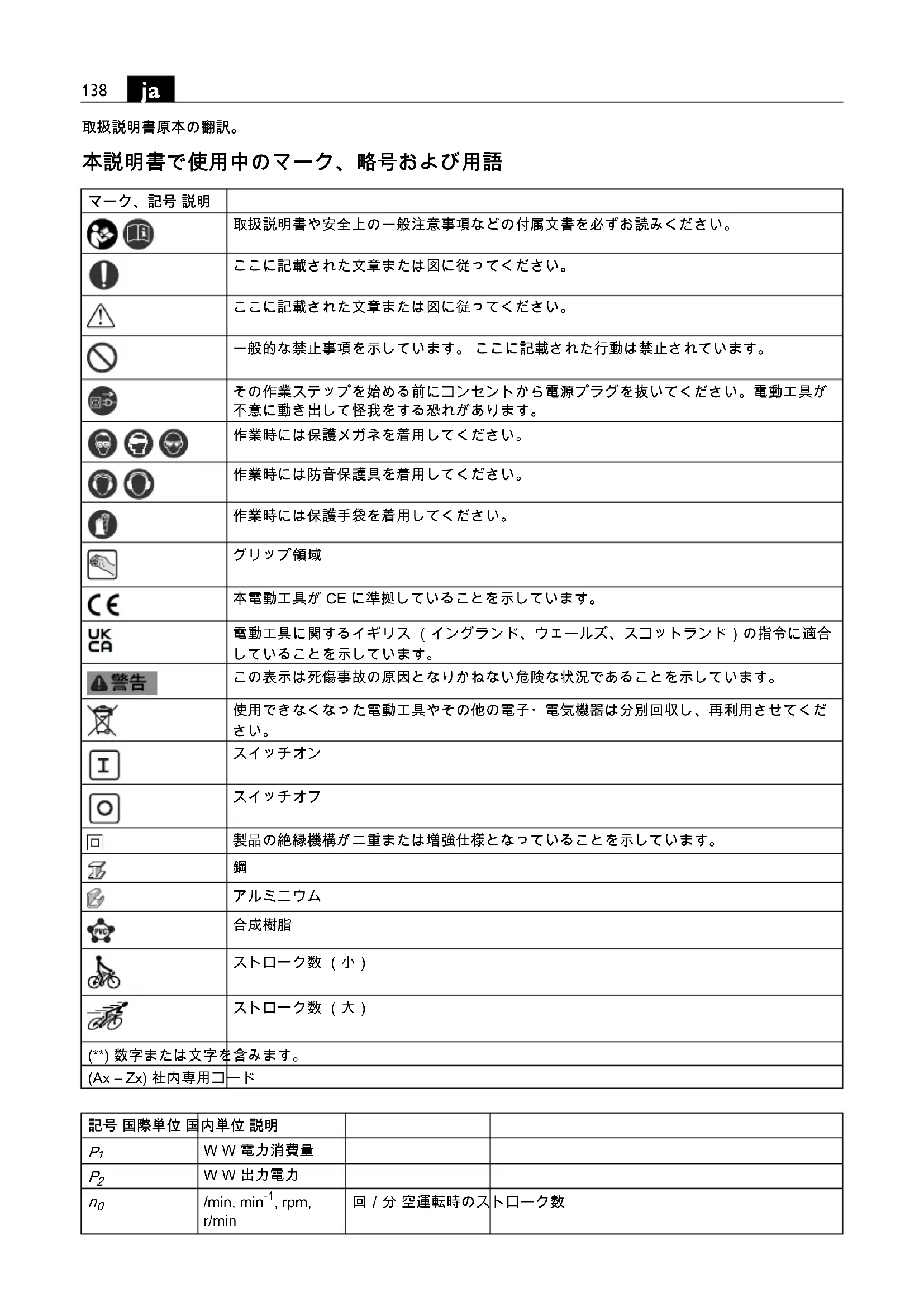 本電動工具が CE に準拠していることを示しています。 電動工具に関するイギリス (イングランド、ウェールズ、スコットランド)の指令に適合 していることを示しています。 この表示は死傷事故の原因となりかねない危険な状況であることを示しています。 使用できなくなった電動工具やその他の電子・電気機器は分別回収し、再利用させてくだ