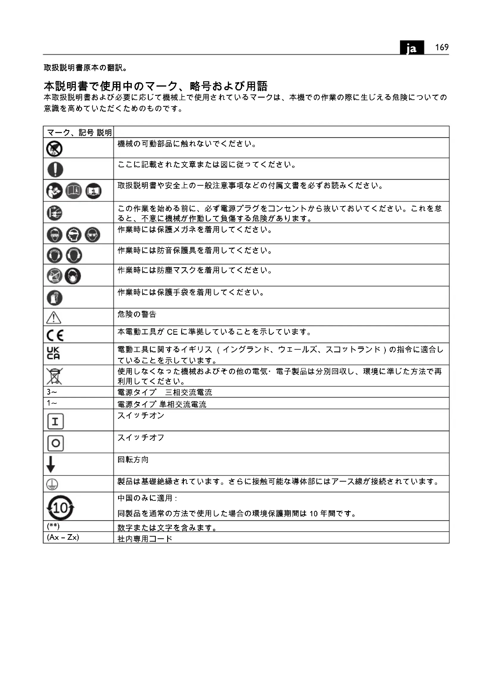 取扱説明書原本の翻訳。 本説明書で使用中のマーク、略号および用語 本取扱説明書および必要に応じて機械上で使用されているマークは、本機での作業の際に生じえる危険についての 意識を高めていただくためのものです。