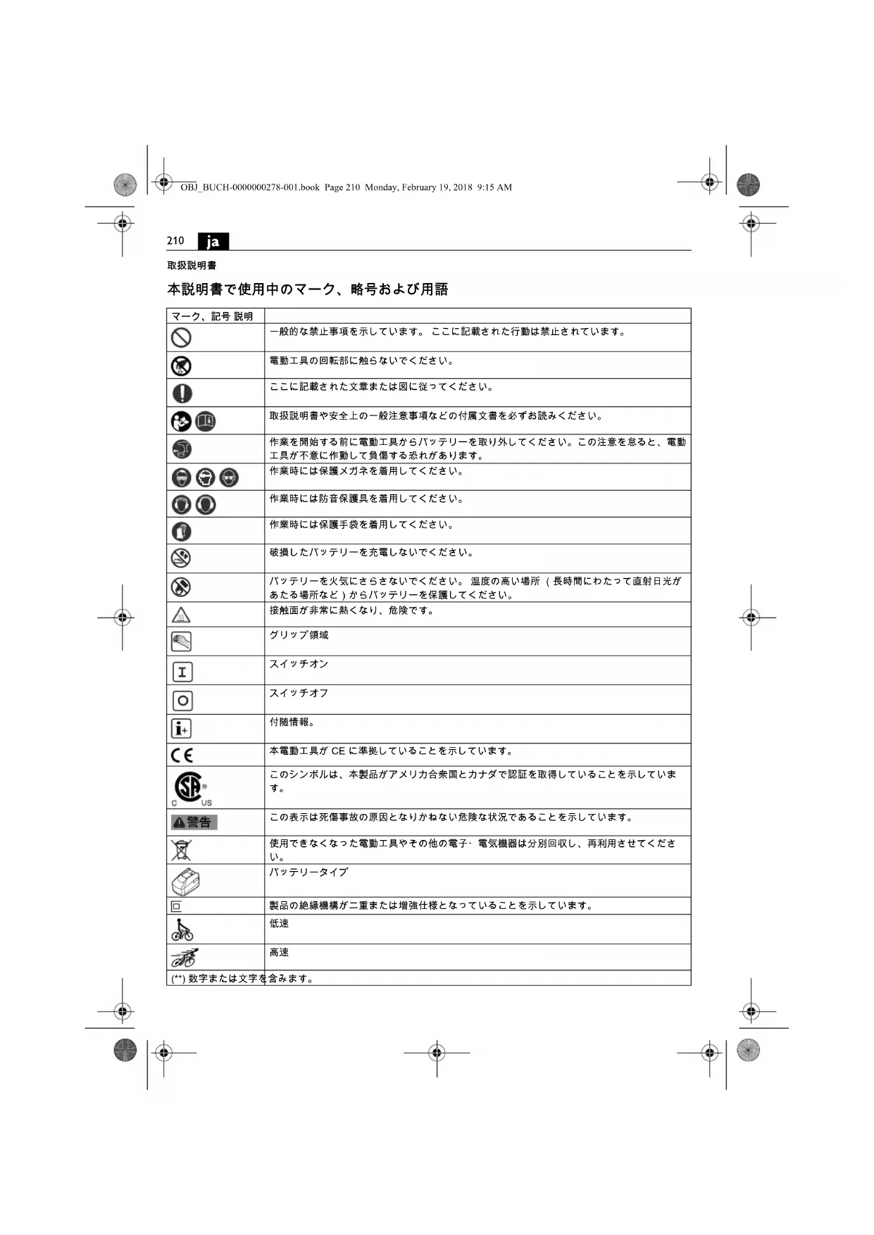 本工具を使用して工作物を加工すると、危険な粉じんが 発生することがあります。 岩石含有物質、塗料溶剤、木材保護剤、船舶用防汚材の アスベスト、アスベスト含有物質、鉛含有塗料、金属、 一部の木材、鉱物、ケイ素粒子等の粉じんと接触した り、これらを吸引するとアレルギー反応、気管支炎、 癌、不妊の原因となる場合があります。 粉じんの吸引に よるリスクは暴露状態に依存します。 発生する粉じんに OBJ_BUCH-0000000278-001.book Page 214 Monday, February 19, 2018 9:15 AM215