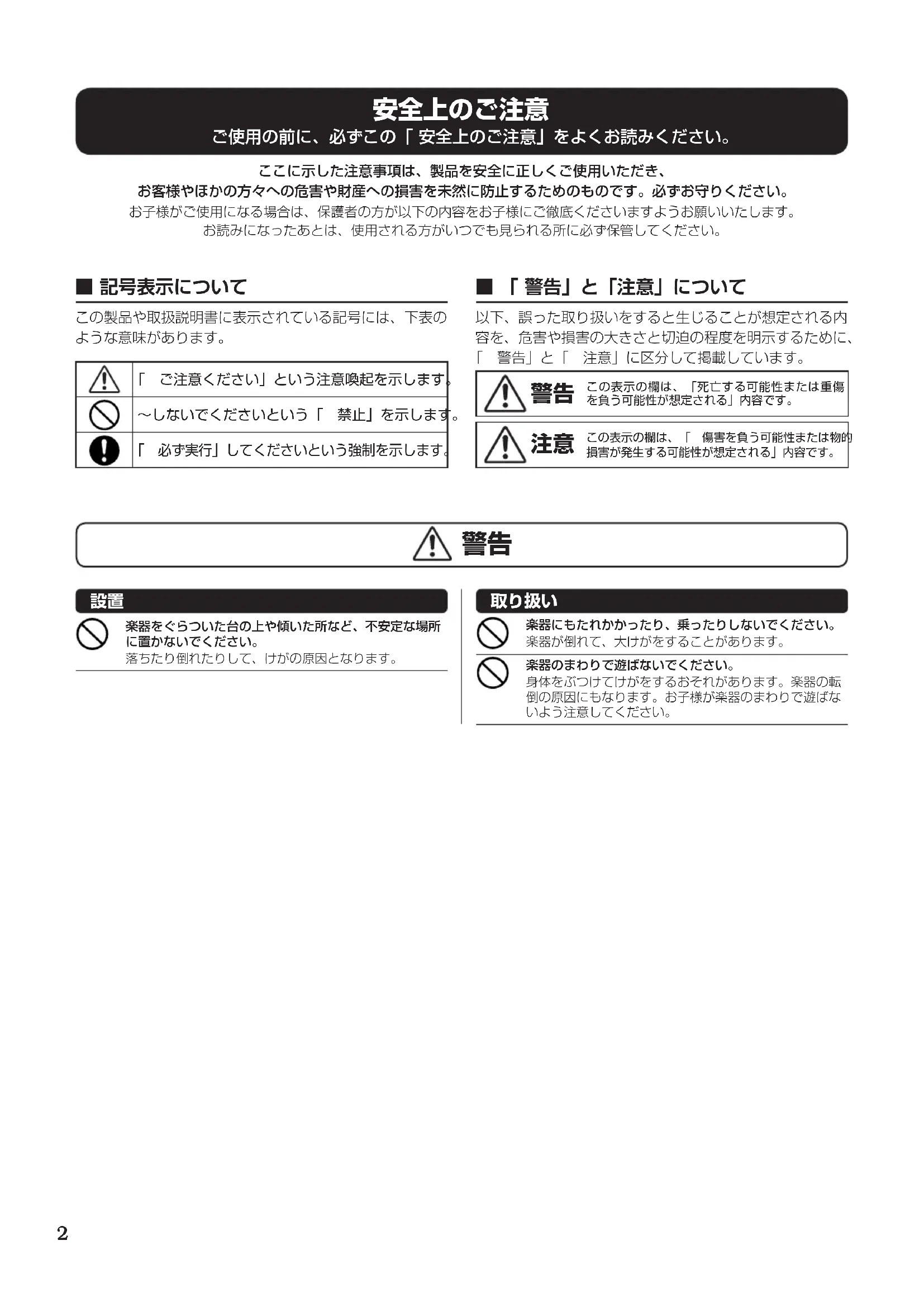 楽器をぐらついた台の上や傾いた所など、不安定な場所に置かないでください。落ちたり倒れたりして、けがの原因となります。 楽器にもたれかかったり、乗ったりしないでください。楽器が倒れて、大けがをすることがあります。楽器のまわりで遊ばないでください。身体をぶつけてけがをするおそれがあります。楽器の転倒の原因にもなります。お子様が楽器のまわりで遊ばないよう注意してください。3