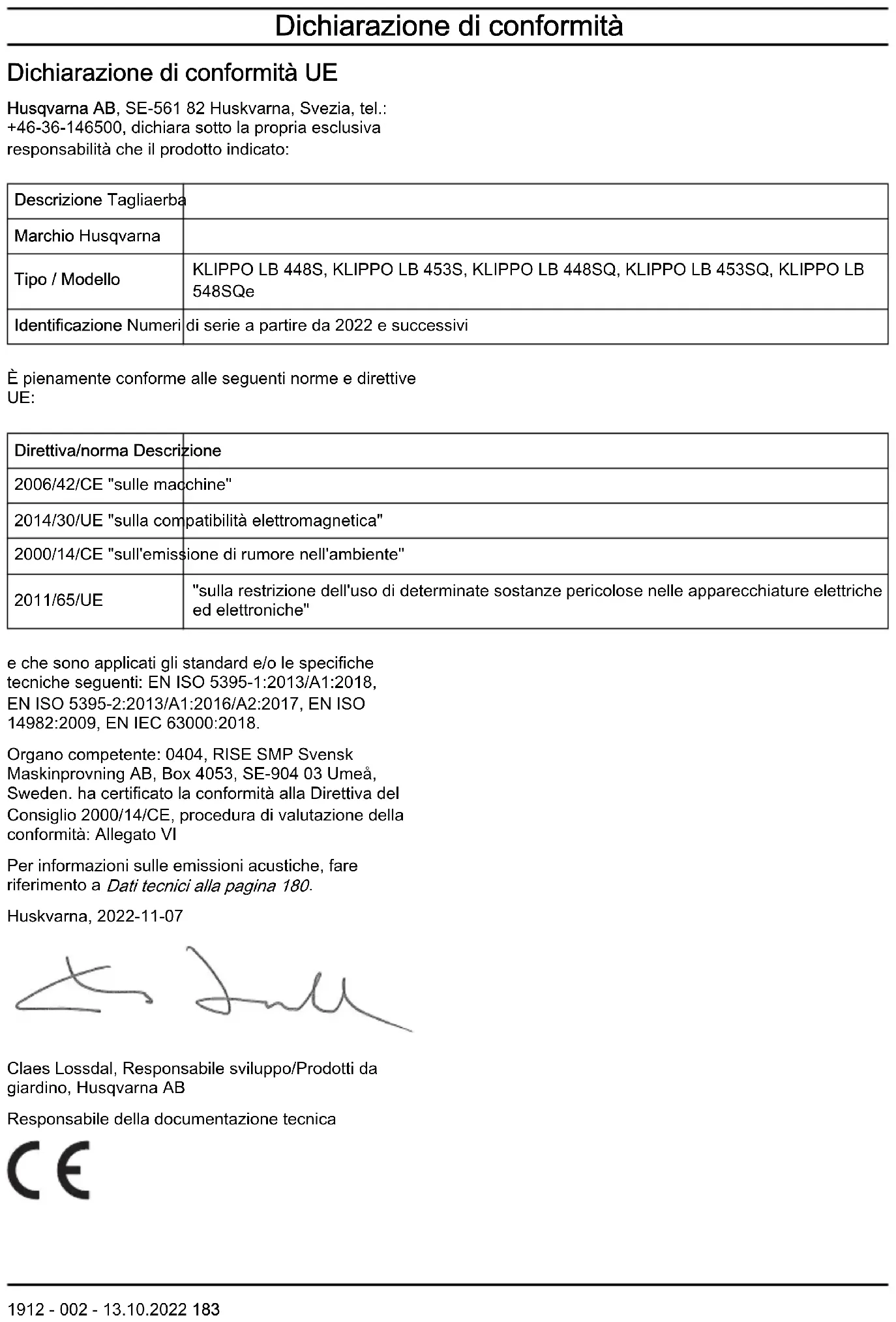KLIPPO LB 448S, KLIPPO LB 453S, KLIPPO LB 448SQ, KLIPPO LB 453SQ, KLIPPO LB 548SQe ID 2022 年以降の製造番号 が以下の EU 指令および規制を完全に順守し、