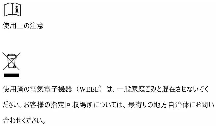 使用済の電気電子機器(WEEE)は、一般家庭ごみと混在させないでく ださい。お客様の指定回収場所については、最寄りの地方自治体にお問い 合わせください。安全アイコンの説明