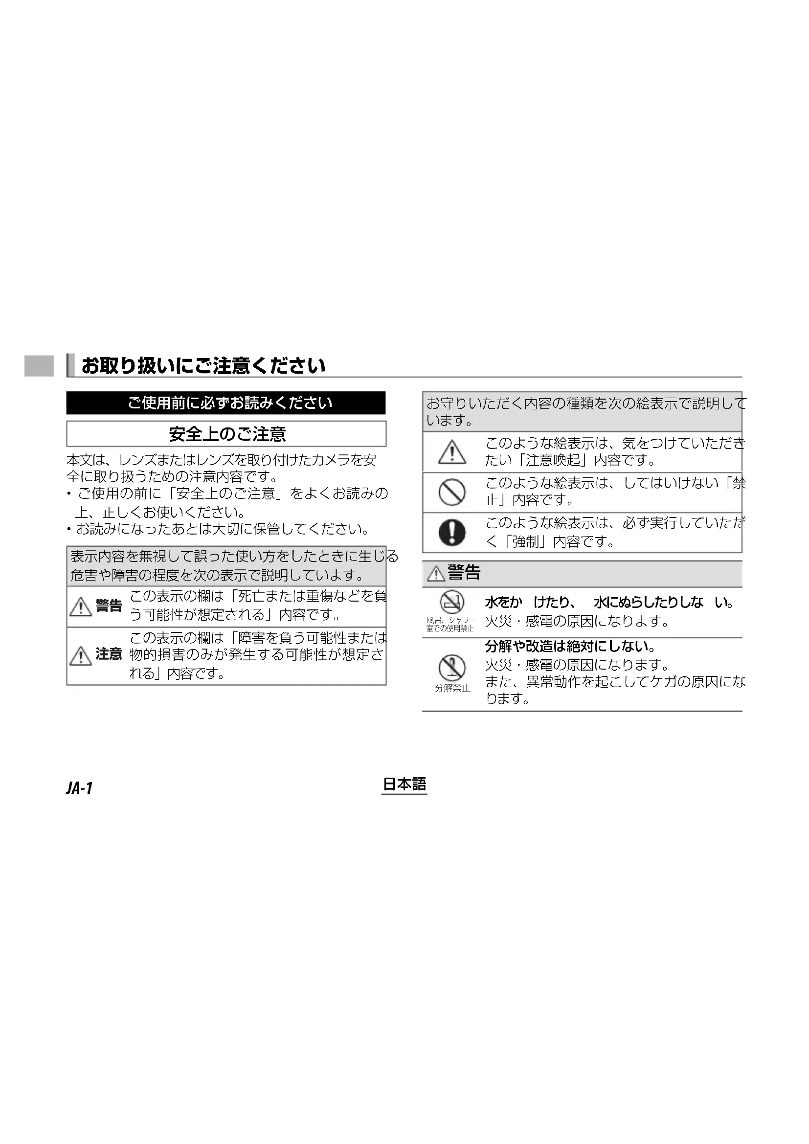 本文は、レンズまたはレンズを取り付けたカメラを安 全に取り扱うための注意内容です。