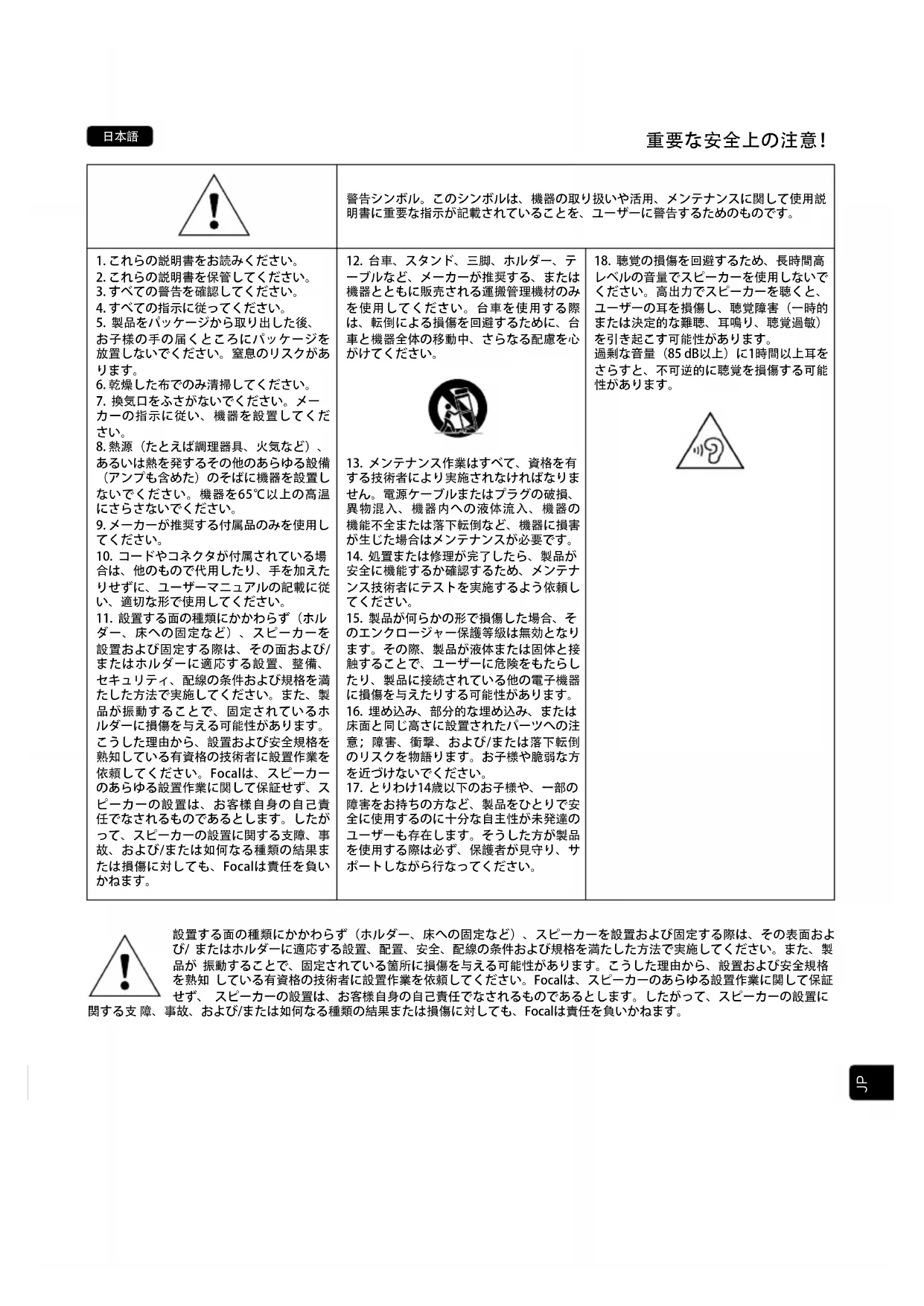 ダー、床への固定など)、スピーカーを 設置および固定する際は、その面および/ またはホルダーに適応する設置、整備、 セキュリティ、配線の条件および規格を満 たした方法で実施してください。また、製 品が振動することで、固定されているホ ルダーに損傷を与える可能性があります。 こうした理由から、設置および安全規格を 熟知している有資格の技術者に設置作業を 依頼してください。Focalは、スピーカー のあらゆる設置作業に関して保証せず、ス ピーカーの設置は、お客様自身の自己責 任でなされるものであるとします。したが って、スピーカーの設置に関する支障、事 故、および/または如何なる種類の結果ま たは損傷に対しても、Focalは責任を負い