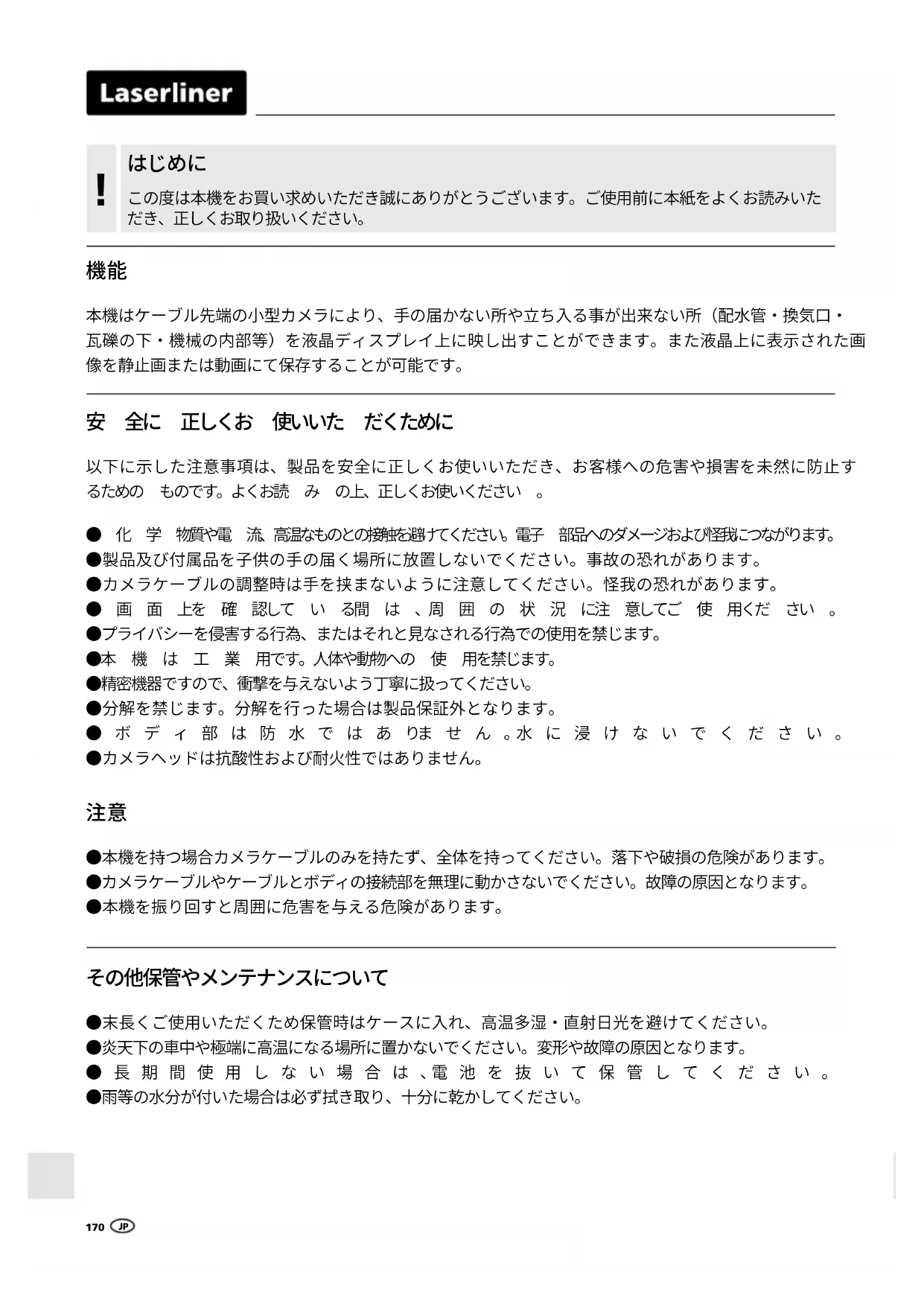 ●本機を持つ場合カメラケーブルのみを持たず、全体を持ってください。落下や破損の危険があります。 ●カメラケーブルやケーブルとボディの接続部を無理に動かさないでください。故障の原因となります。 ●本機を振り回すと周囲に危害を与える危険があります。 その他保管やメンテナンスについて ●末長くご使用いただくため保管時はケースに入れ、高温多湿・直射日光を避けてください。 ●炎天下の車中や極端に高温になる場所に置かないでください。変形や故障の原因となります。 ● 長 期 間 使 用 し な い 場 合 は 、電 池 を 抜 い て 保 管 し て く だ さ い 。 ●雨等の水分が付いた場合は必ず拭き取り、十分に乾かしてください。 安 全に 正しくお 使いいた だくために 以下に示した注意事項は、製品を安全に正しくお使いいただき、お客様への危害や損害を未然に防止す るための ものです。よくお読 み の上、正しくお使いください 。 ● 化 学 物質や電 流、高温なものとの接触を避けてください。電子 部品へのダメージおよび怪我につながります。 ●製品及び付属品を子供の手の届く場所に放置しないでください。事故の恐れがあります。 ●カメラケーブルの調整時は手を挟まないように注意してください。怪我の恐れがあります。 ● 画 面 上を 確 認して い る間 は 、周 囲 の 状 況 に注 意してご 使 用くだ さい 。 ●プライバシーを侵害する行為、またはそれと見なされる行為での使用を禁じます。 ●本 機 は 工 業 用です。人体や動物への 使 用を禁じます。 ●精密機器ですので、衝撃を与えないよう丁寧に扱ってください。 ●分解を禁じます。分解を行った場合は製品保証外となります。 ● ボ デ ィ 部 は 防 水 で は あ りま せ ん 。水 に 浸 け な い で く だ さ い 。 ●カメラヘッドは抗酸性および耐火性ではありません。