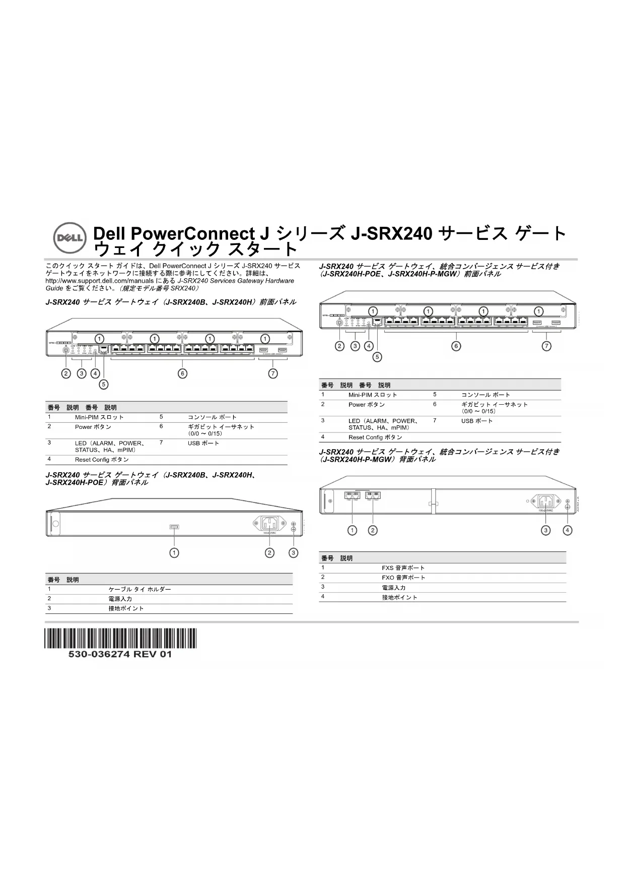 g037518 Dell PowerConnect J シリーズ J-SRX240 サービス ゲート ウェイ クイック スタート2 ページ J-SRX240 サービス ゲートウェイ モデル J-SRX240 サービス ゲートウェイには、次の 4 モデルがあります。