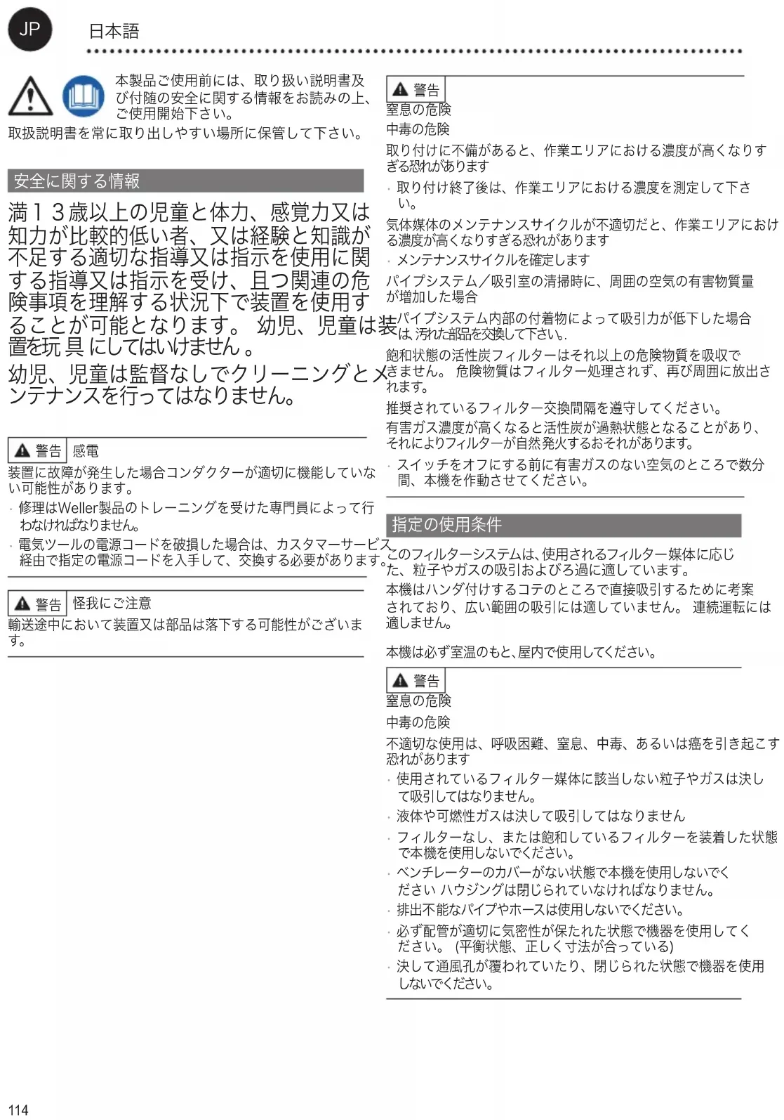 システムの所有者は、法律で定められた作業場における有害 物質限界値を遵守する責任を負います。 このフィルターシステムは、技術上不備のない状態でのみ作 動 さ せ て く だ さ い 。 はんだ付けステーション/はんだ除 去ステーションの 使用目的は 取り扱い説明書に記載条項に基づいています。
