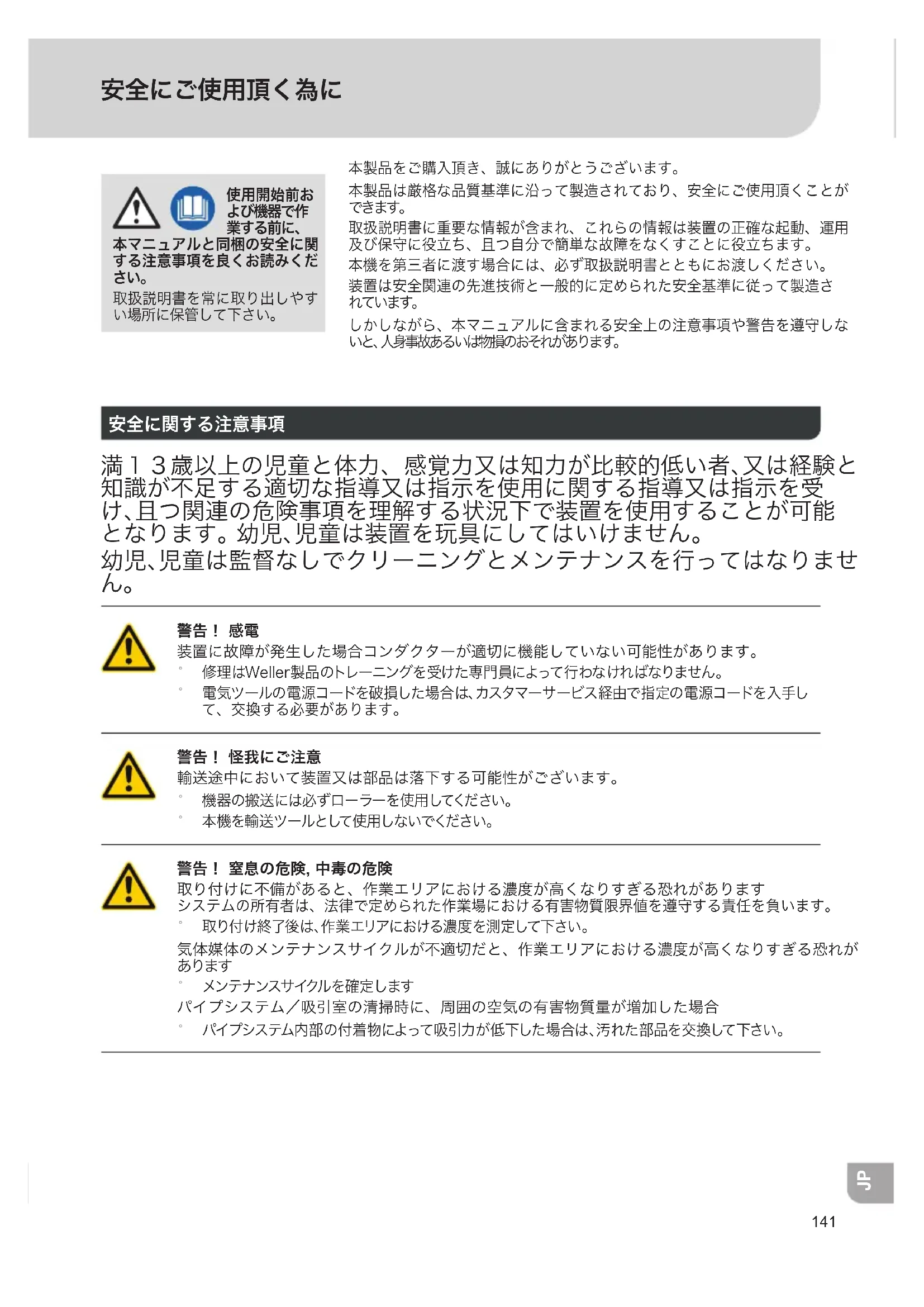 輸送途中において装置又は部品は落下する可能性がございます。 ˚ 機器の搬送には必ずローラーを使用してください。 ˚ 本機を輸 送ツールとして使用しないでください。 警告! 窒息の危険, 中毒の危険 取り付けに不備があると、作業エリアにおける濃度が高くなりすぎる恐れがあります システムの所有者は、法律で定められた作業場における有害物質限界値を遵守する責任を負います。 ˚ 取り付け終了後は、作業エリアにおける濃度を測定して下さい。 気体媒体のメンテナンスサイクルが不適切だと、作業エリアにおける濃度が高くなりすぎる恐れが