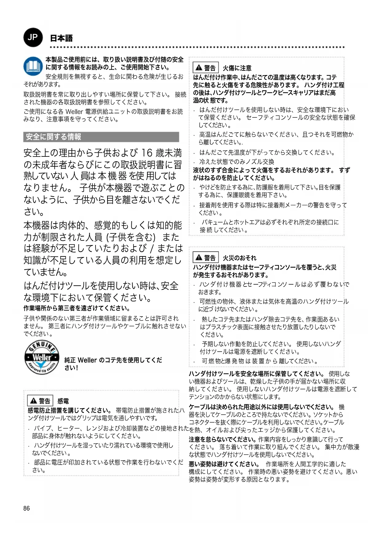 取扱説明書を常に取り出しやすい場所に保管して下さい。 接続 された機器の各取扱説明書を参照してください。 ご使用になる各 Weller 電源供給ユニットの取扱説明書をお読 みなり、注意事項を守ってください。