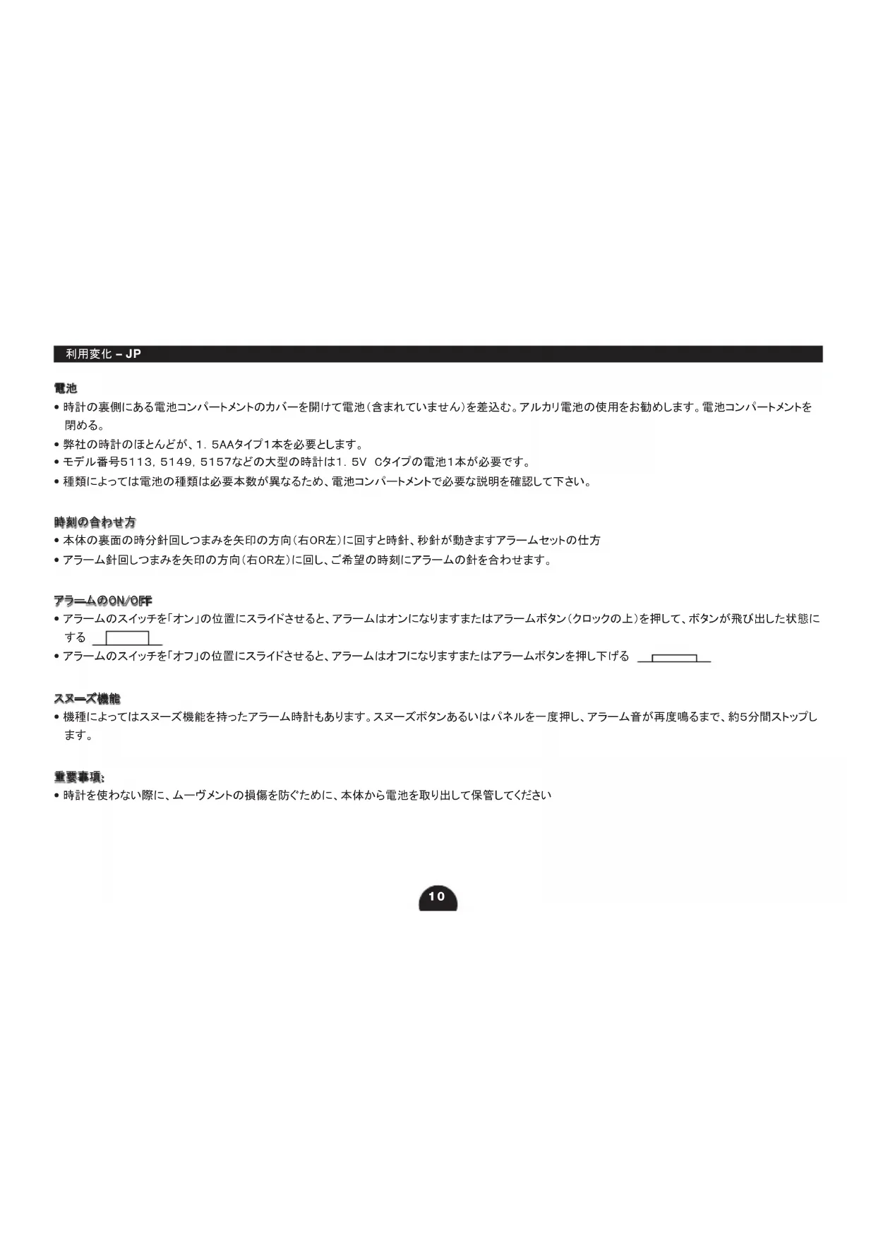 - モデル番号5113,5149,5157などの大型の時計は1.5V Cタイプの電池1本が必要です。