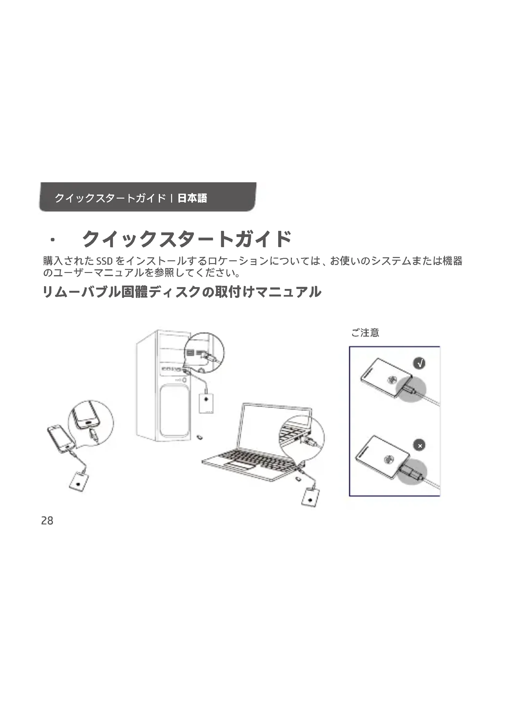 - クイックスタートガイド リムーバブル固體ディスクの取付けマニュアル 購入された SSD をインストールするロケーションについては 、 お使いのシステムまたは機器 のユーザーマニュアルを参照してください。 クイックスタートガイド | 日本語 Portable SSD P700