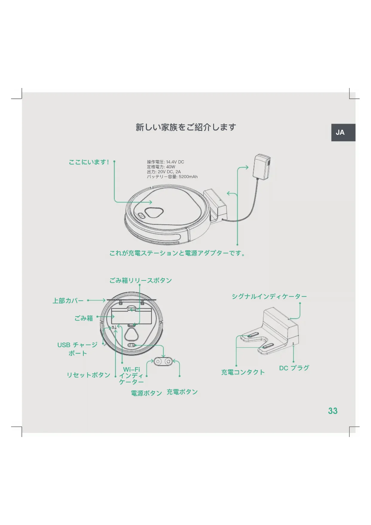 2. ロボットを解体または自分でバッテリーを交換しないでください。交換が必要な際はサポート部門にお問い合わせください。3. 製造者が提供する充電アダプターのみ使用してください。 4. 濡れた手でコンセントと電源アダプターに触らないでください。 5. ロボットをたばこの吸い殻、ライター、その他のくすぶった火の近くに置かないでください。 6. ワイヤーを過度に曲げたり、重いものや尖ったものをロボットの上に置かないでください。7. ロボットの上に座らないでください。 8. 濡れた湿気のある環境でロボットにスイッチを入れないでください。9. 熱源や直火の近くでロボットを使用しないでください。10. ロボットを使用する前に、掃除をする場所から小物または壊れやすい物を取り除いてください。 11. ロボットが落下する可能性のあるテーブルまたは椅子の上にロボットを置かないでください。 12. 使用前に電源アダプターがコンセントに接続されていることを確認してください。13. ご家族がロボットにつまづくのを避けるため、ロボットを使用する際はその旨を伝えてください。14. ごみ箱が満タンになったら空にしてください。15. 室内温度で操作してください。製品またはバッテリーを極度に寒い場所または暑い場所に置かないでください (40°C/104°F以上、または0°C/32°F以下)。16. 固い物でガラス窓を押したり傷つけないでください。 17. 上部カバーが空いている時はロボットのスイッチを入れないでください。 18. ロボットがぶつからないように、電源コードおよびブラインドやカーテンのコードを邪魔にならない場所に移動してください。19. ロボットが大きな破片、こぼれた液体、漂白剤、塗料、ガソリンまたはタバコ、マッチ、灰がらなどの可燃性物質を JA59 吸い込まないよう、気を付けてください。