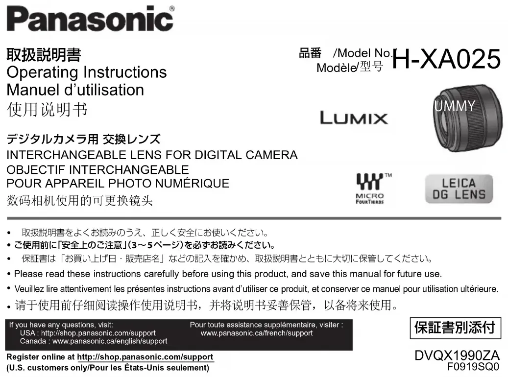 ▼お買い上げの際に記入されると便利です 技術料 診断・修 理・調 整・点 検 な ど の 費 用部品代 部品および補助材料代出張料 技術者を派遣する費用※ 補修用性能部品の保有期間8年 H-XA025-DVQX1990.book 13 ページ 2019年9月2日 月曜日 午後7時17分14 DVQX1990 (JPN) ∫ 転居や贈答品などでお困りの場合は、次の窓口にご相談ください。 【ご相談窓口におけるお客様の個人情報のお取り扱いについて】 パナソニック株式会社およびグループ関係会社は、お客様の個人情報をご相談対応や修理対応などに利用させて いただき、ご相談内容は録音させていただきます。 また、折り返し電話をさせていただくときのために発信番号を通知いただいております。なお、個人情報を適切に 管理し、修理業務等を委託する場合や正当な理由がある場合を除き、第三者に開示・提供いたしません。 個人情報に関するお問い合わせは、ご相談いただきました窓口にご連絡ください。 H-XA025-DVQX1990.book 14 ページ 2019年9月2日 月曜日 午後7時17分15 (ENG) DVQX1990 English Operating Instructions INTERCHANGEABLE LENS