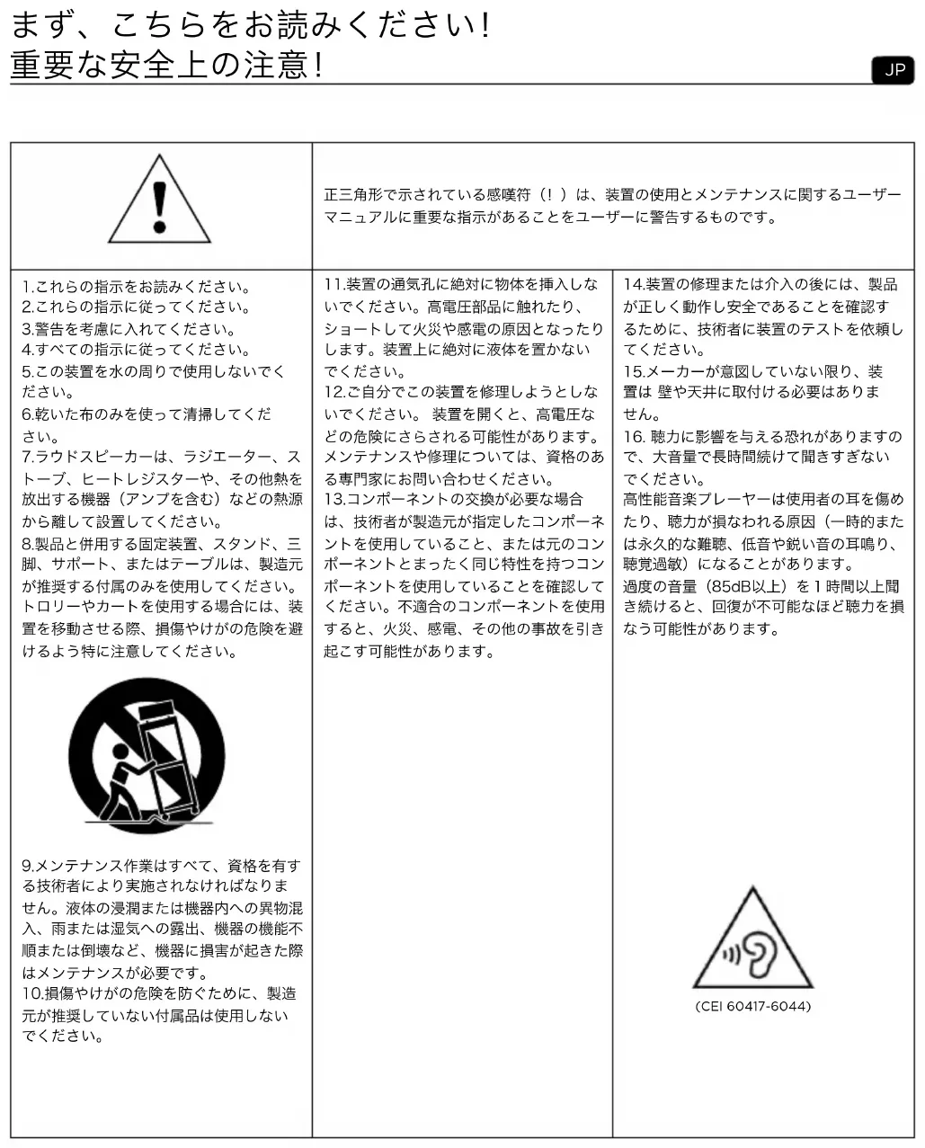 正三角形で示されている感嘆符(!)は、装置の使用とメンテナンスに関するユーザー マニュアルに重要な指示があることをユーザーに警告するものです。 1.これらの指示をお読みください。 2.これらの指示に従ってください。 3.警告を考慮に入れてください。 4.すべての指示に従ってください。 5.この装置を水の周りで使用しないでく