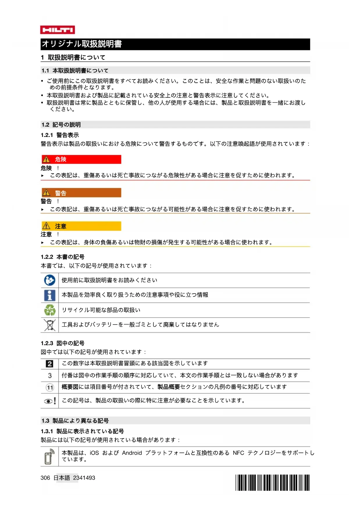 9 メーカー保証 ▶ 保証条件に関するご質問は、最寄りのHilti 代理店・販売店までお問い合わせください。314 日本語 2341493 *2341493* 10 その他の情報 ご使用の製品向けのアクセサリー、システム製品および詳細情報は、ここでご確認ください。