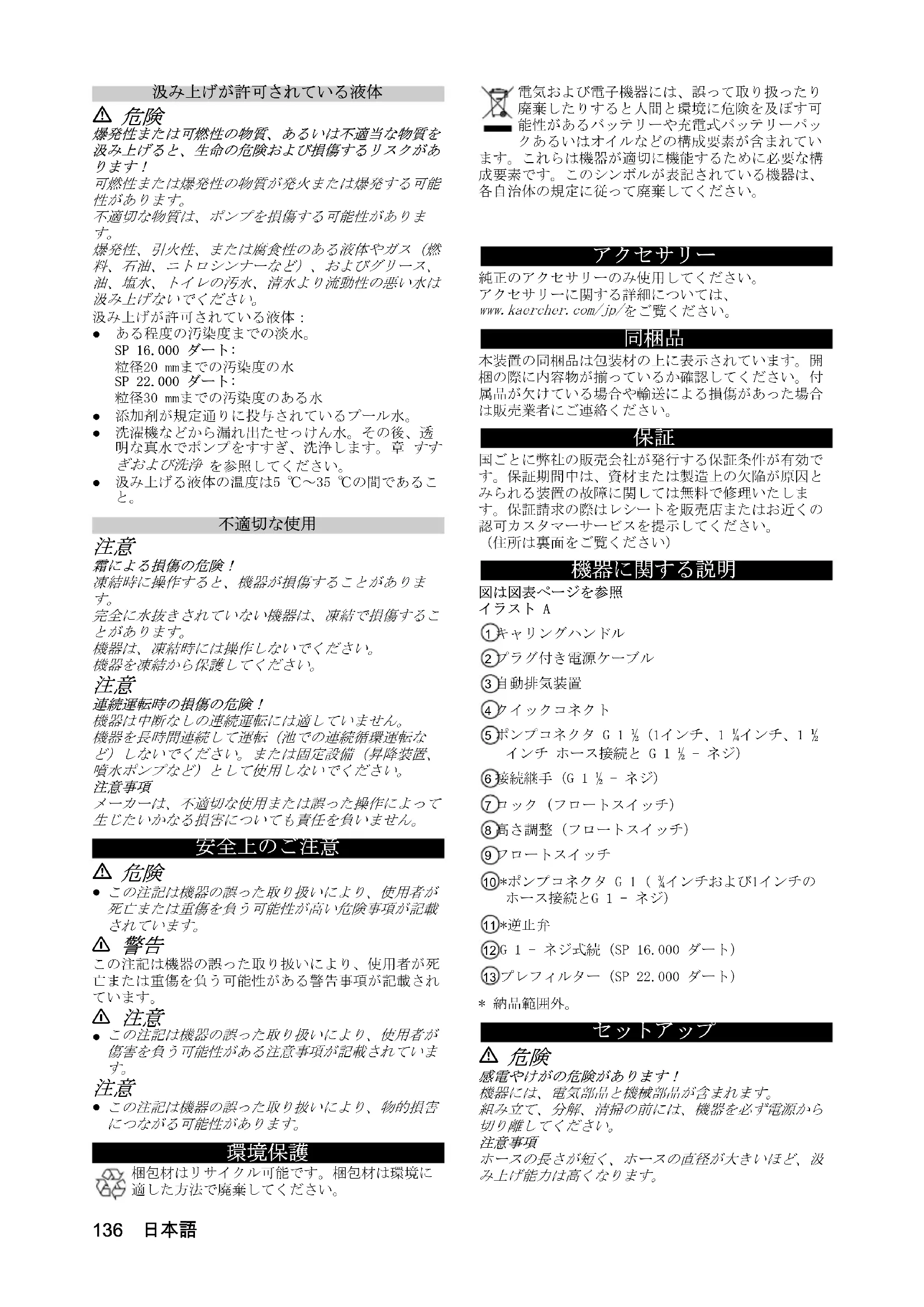 本装置の同梱品は包装材の上に表示されています。開梱の際に内容物が揃っているか確認してください。付属品が欠けている場合や輸送による損傷があった場合は販売業者にご連絡ください。 国ごとに弊社の販売会社が発行する保証条件が有効です。保証期間中は、資材または製造上の欠陥が原因とみられる装置の故障に関しては無料で修理いたします。保証請求の際はレシートを販売店またはお近くの認可カスタマーサービスを提示してください。(住所は裏面をご覧ください) 図は図表ページを参照イラスト A1 キャリングハンドル2 プラグ付き電源ケーブル3 自動排気装置4 クイックコネクト5 ポンプコネクタ G 1 ½ (1インチ、1 ¼インチ、1 ½インチ ホース接続と G 1 ½ - ネジ)6 接続継手 (G 1 ½ - ネジ)7 ロック(フロートスイッチ)8 高さ調整(フロートスイッチ)9 フロートスイッチ10 *ポンプコネクタ G 1 ( ¾インチおよび1インチのホース接続とG 1 - ネジ)11 *逆止弁12 G 1 - ネジ式続(SP 16.000 ダート)13 プレフィルター(SP 22.000 ダート)* 納品範囲外。