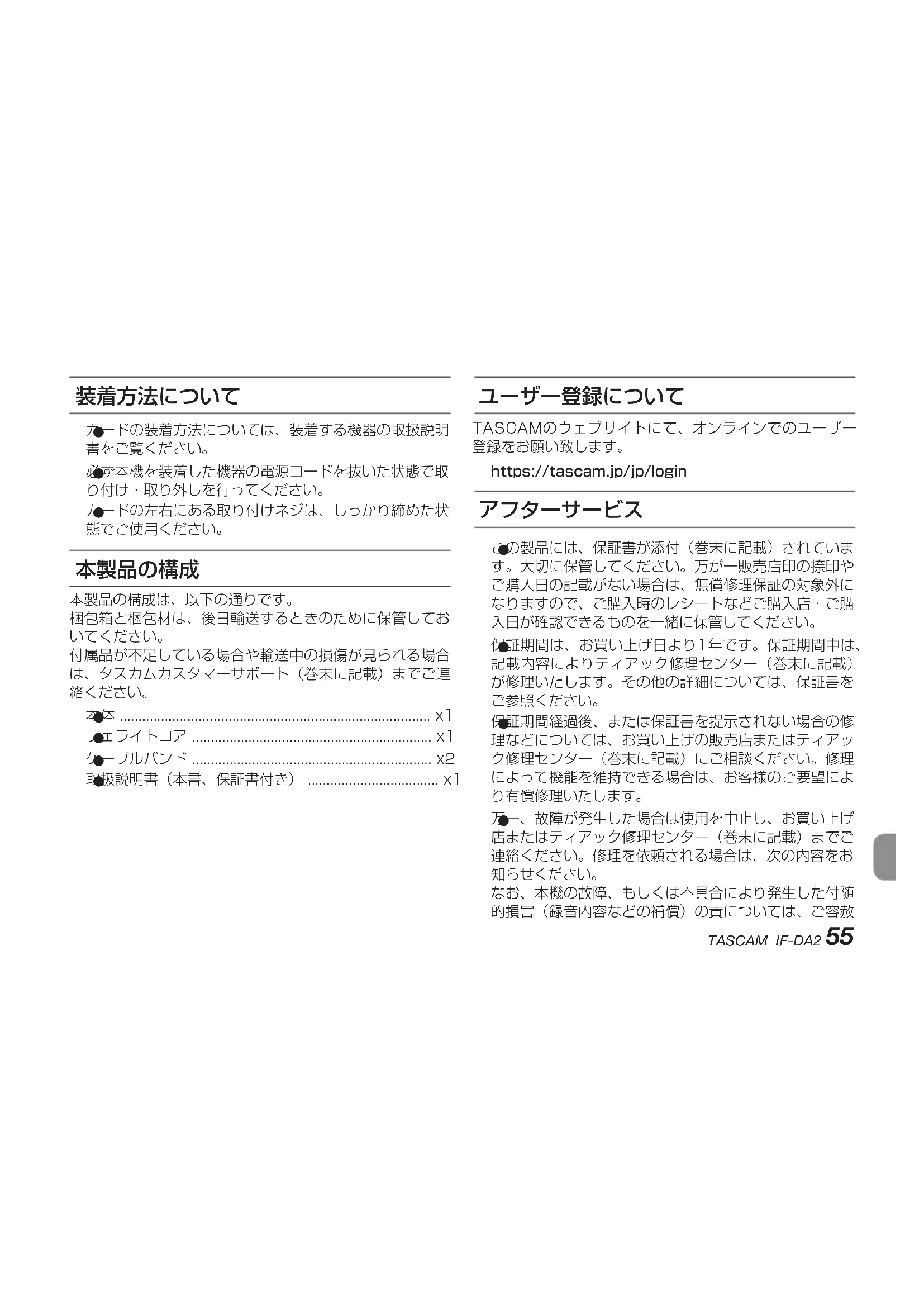 5年に1度は、機器内部の掃除を販売店またはティアック 修理センター(巻末に記載)にご相談ください。 内部にほこりがたまったまま、長い間掃除をしないと火 災や故障の原因となることがあります。特に、湿気の多 くなる梅雨期の前に行うと、より効果的です。なお、掃 除費用については、ご相談ください。54 TASCAM IF-DA2 このたびは、Danteインターフェースカード TASCAM IF-DA2をお買い上げいただきまして、誠にありがとうご