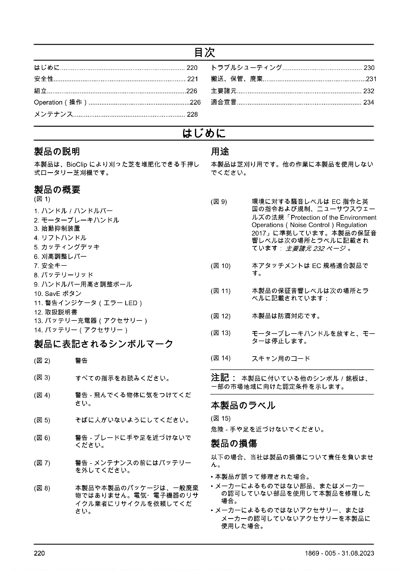1869 - 005 - 31.08.2023• 芝刈機は急斜面では使用しないでください。制御が 効かずに滑って転倒して負傷する可能性が減少しま
