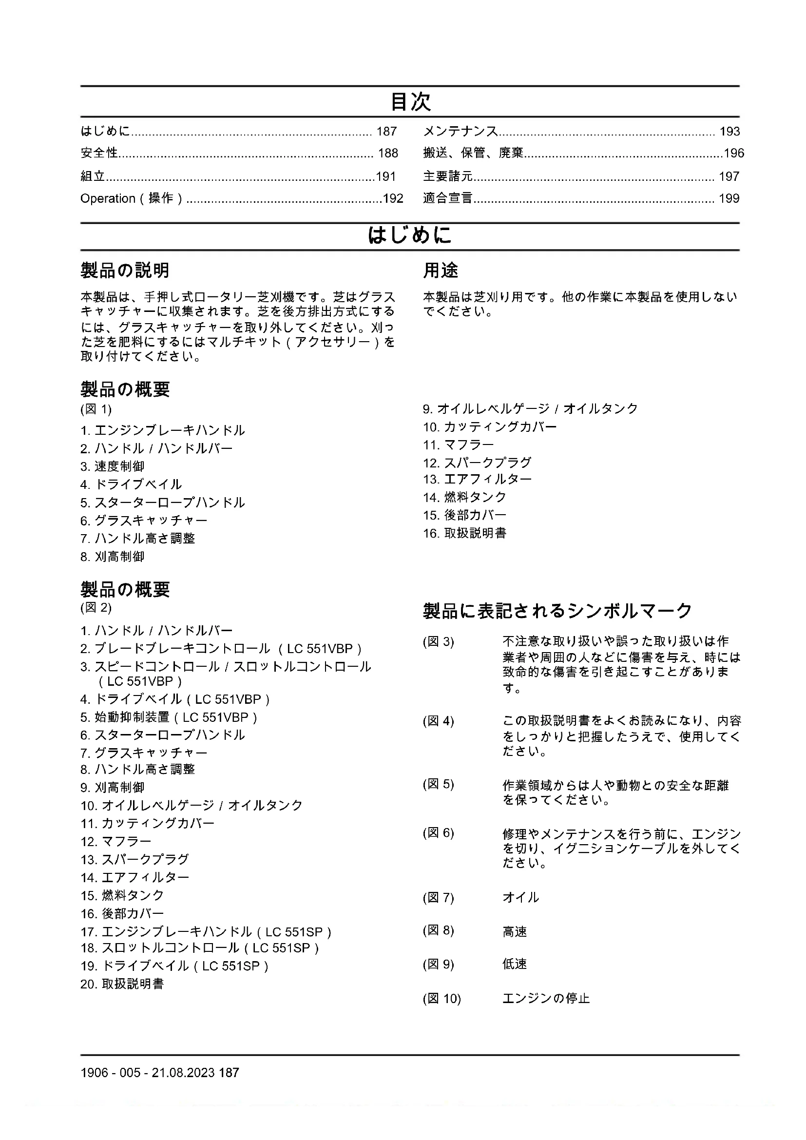 - 刈高を変更する場合は、まずエンジンを停止してく ださい。エンジンが作動している状態での調整は決 して行わないでください。 1906 - 005 - 21.08.2023 189• エンジンが作動している状態で、見えない場所に製 品を放置しないでください。エンジンを停止し、カ ッティング装置が回転していないことを確認してく