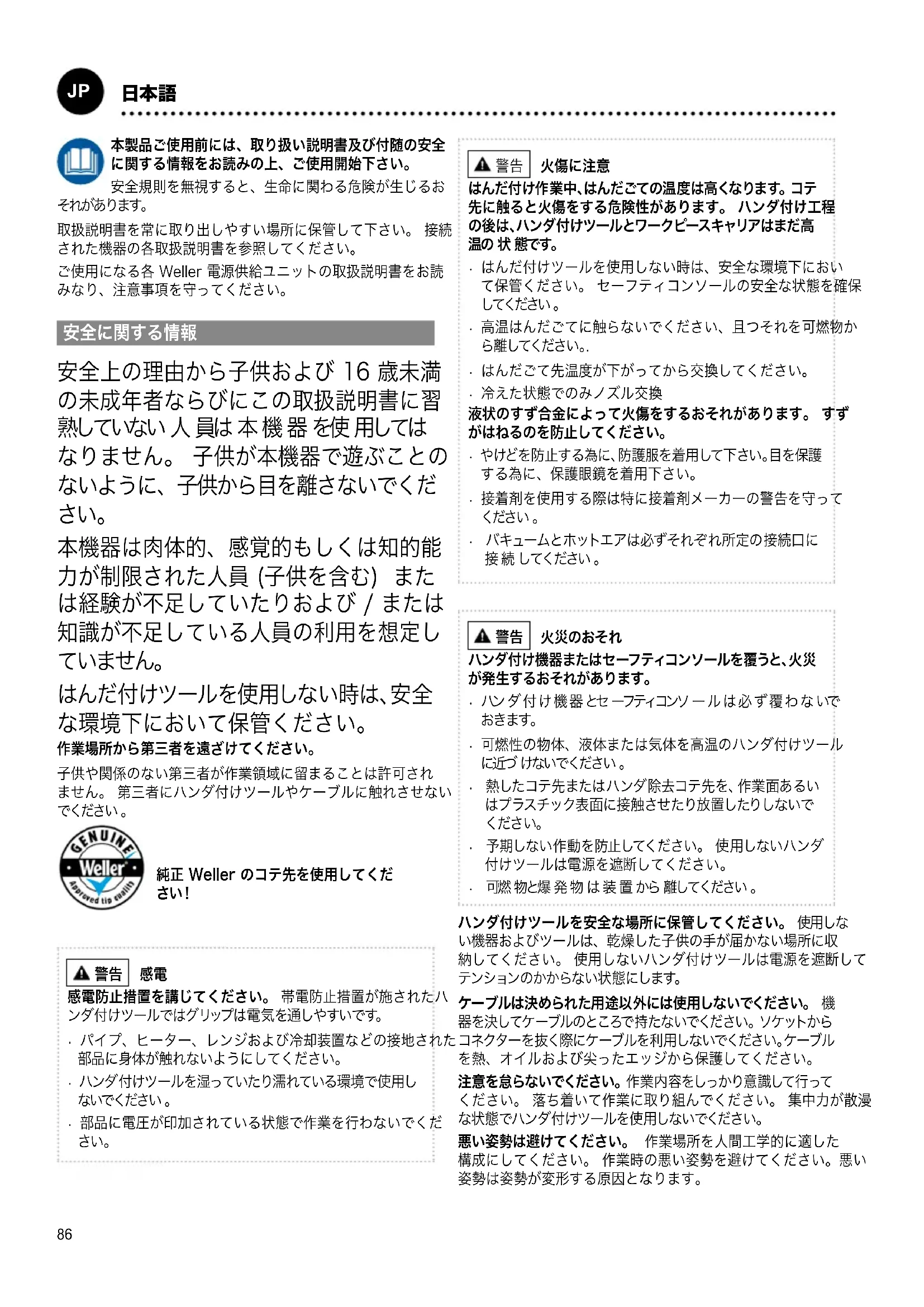 取扱説明書を常に取り出しやすい場所に保管して下さい。 接続 された機器の各取扱説明書を参照してください。 ご使用になる各 Weller 電源供給ユニットの取扱説明書をお読 みなり、注意事項を守ってください。