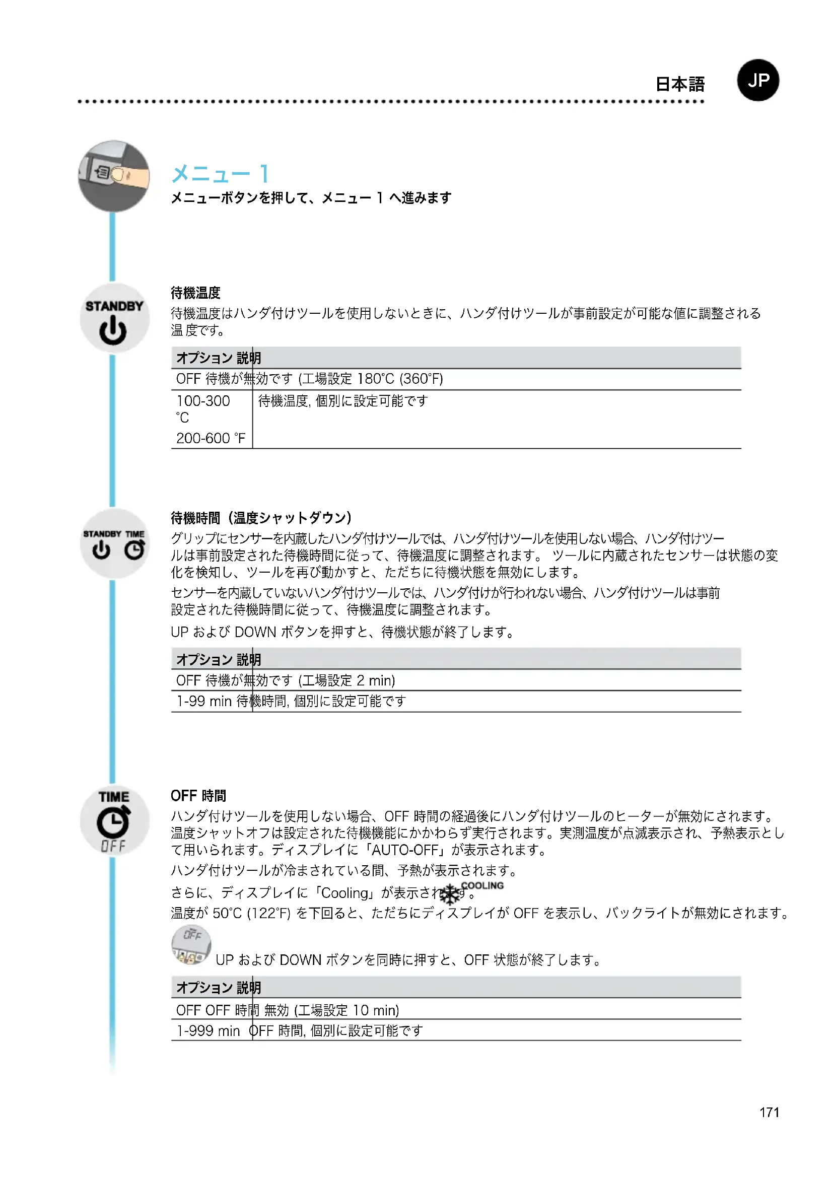 OFF 待機が無効です (工場設定 2 min) 1-99 min 待機時間, 個別に設定可能です OFF 時間 ハンダ付けツールを使用しない場合、OFF 時間の経過後にハンダ付けツールのヒーターが無効にされます。 温度シャットオフは設定された待機機能にかかわらず実行されます。実測温度が点滅表示され、予熱表示とし て用いられます。ディスプレイに「AUTO-OFF」が表示されます。 ハンダ付けツールが冷まされている間、予熱が表示されます。 さらに、ディスプレイに「Cooling」が表示されます。