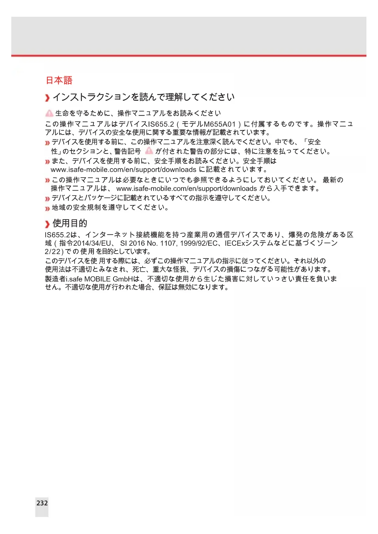 IS655.2は、インターネット接続機能を持つ産業用の通信デバイスであり、爆発の危険がある区 域(指令2014/34/EU、 SI 2016 No. 1107, 1999/92/EC、IECExシステムなどに基づくゾーン 2 / 2 2)で の 使 用 を目的としています。 このデバイスを使 用する際には、必ずこの操作マニュアルの指示に従ってください。それ以外の 使用法は不適切とみなされ、死亡、重大な怪我、デバイスの損傷につながる可能性があります。 製造者i.safe MOBILE GmbHは、不適切な使用から生じた損害に対していっさい責任を負いま せん。不適切な使用が行われた場合、保証は無効になります。JP 233