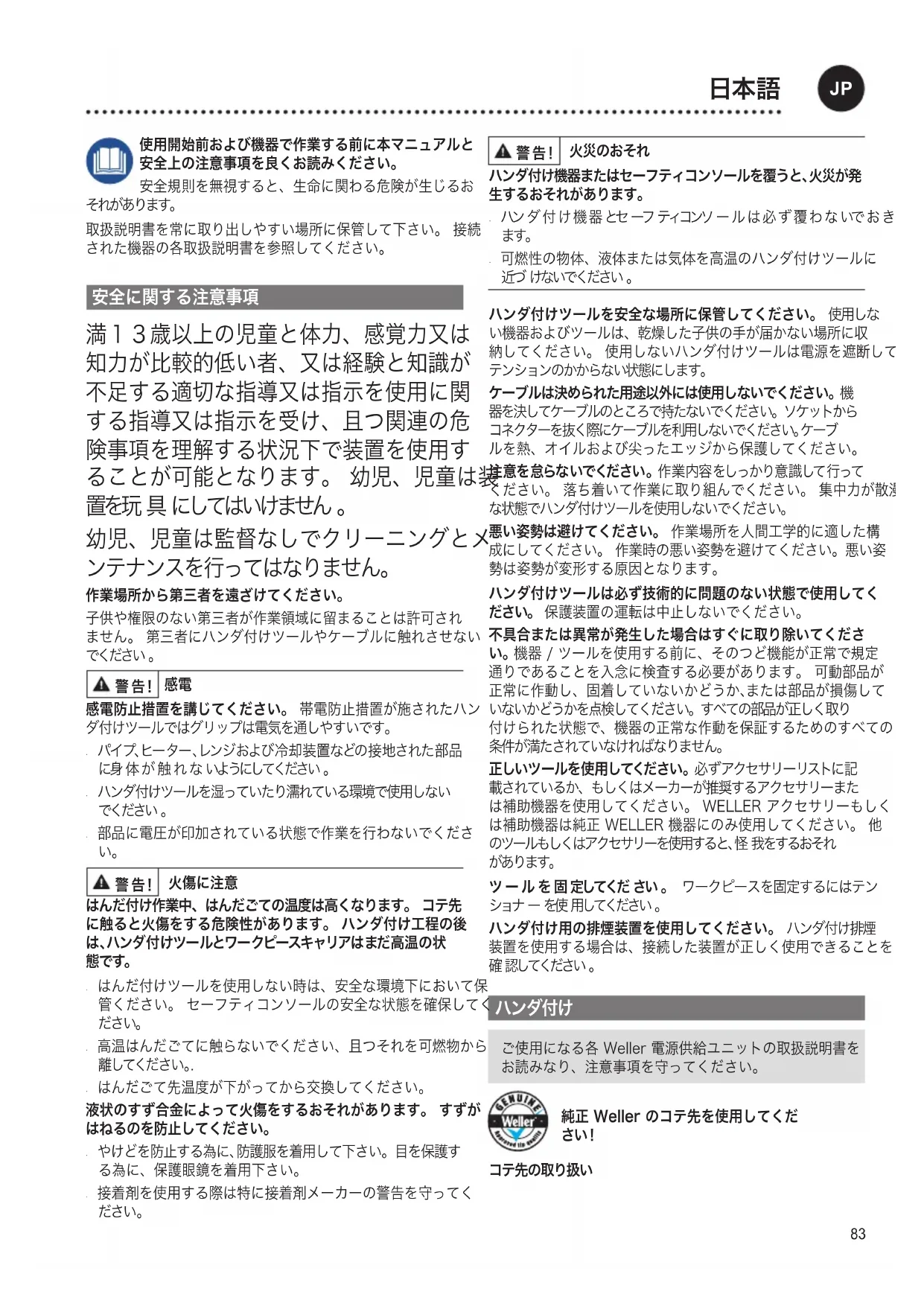 ご使用になる各 Weller 電源供給ユニットの取扱説明書を お読みなり、注意事項を守ってください。 純正 Weller のコテ先を使用してくだ