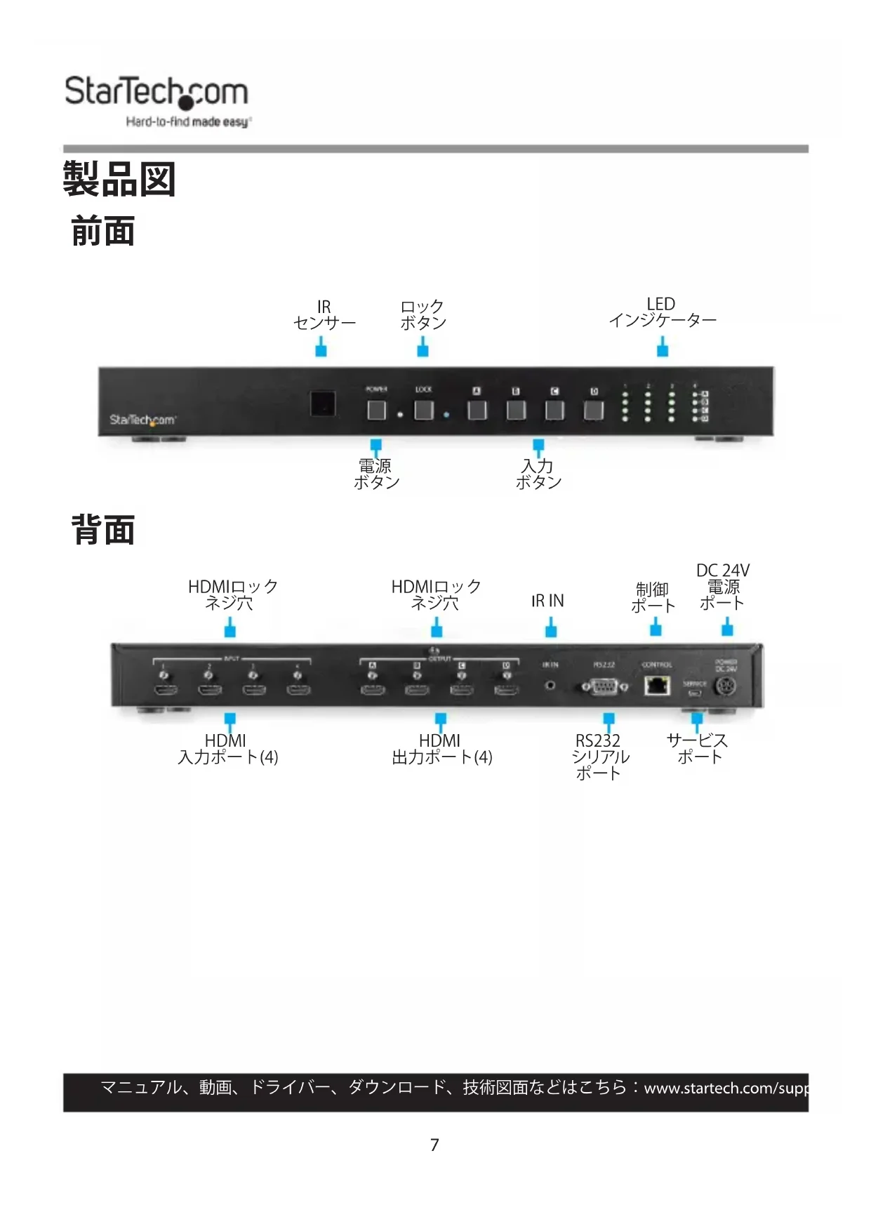 HDMI 入力ポート(4) HDMIロック ネジ穴8 マニュアル、動画、ドライバー、ダウンロード、技術図面などはこちら:www.startech.com/support
