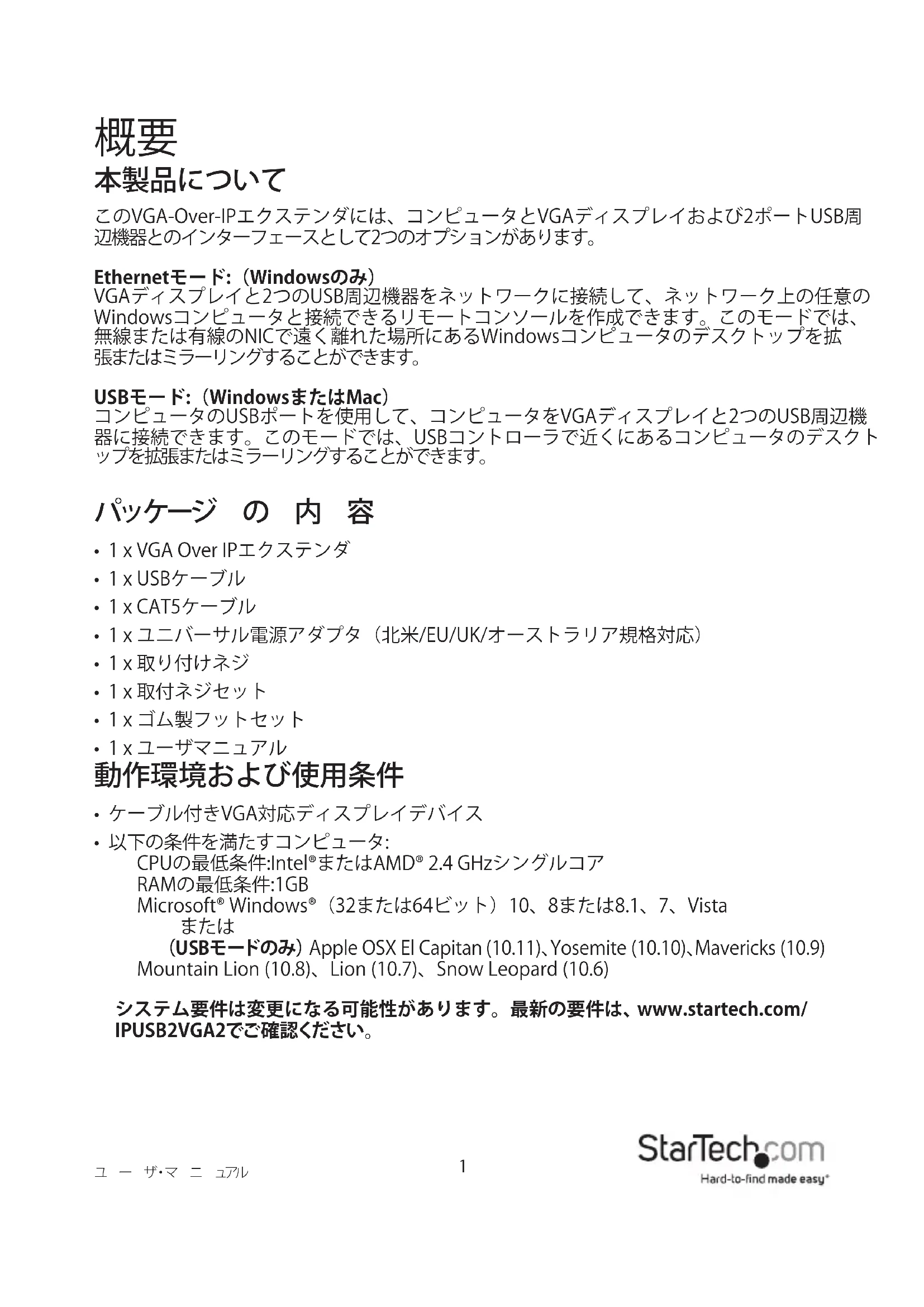 (USBモードのみ) Apple OSX El Capitan (10.11)、Yosemite (10.10)、Mavericks (10.9) Mountain Lion (10.8)、Lion (10.7)、Snow Leopard (10.6) システム要件は変更になる可能性があります。最新の要件は、 www.startech.com/ IPUSB2VGA2でご 確 認くだ さい 。ユ ー ザ・マ ニ ュアル